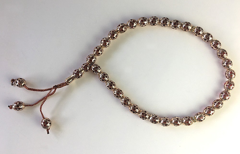 Chapelet (Sabha) a 33 grains couleur dores avec motifs rouge