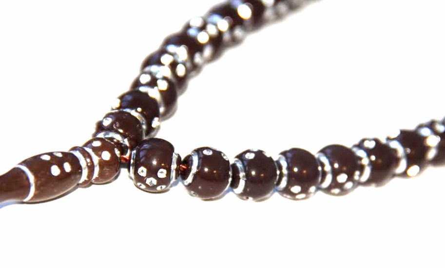 Chapelet "Sebha" marron fonce a 33 grains avec motifs argentes