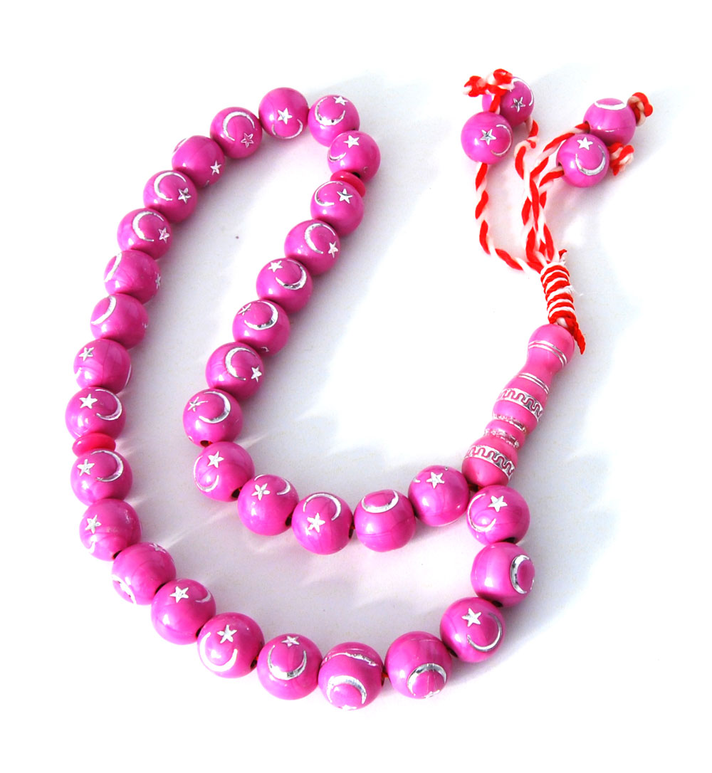 Chapelet "Sebha" rose fuchsia à 33 gros grains avec motifs argentés - REF. 25744 (4.90 €)