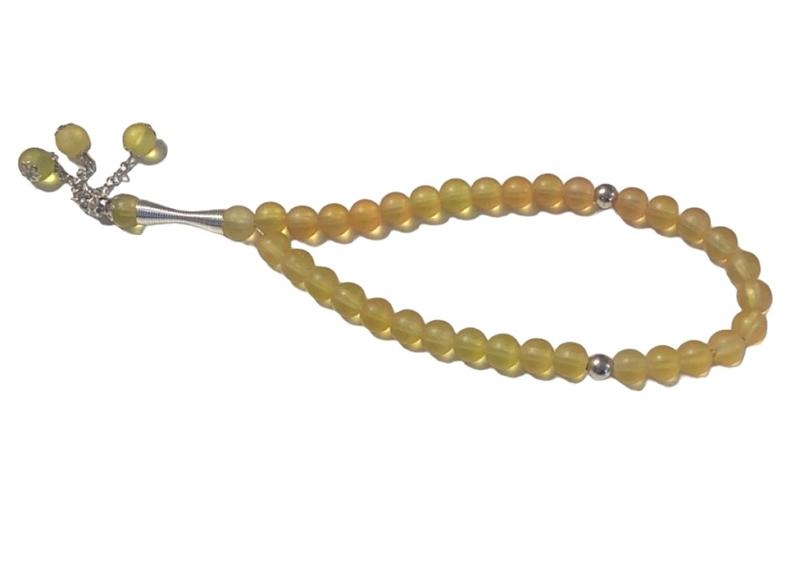 Chapelet (Sebha) de luxe à 33 grosses perles de couleur Jaune ambre avec parties argentées.