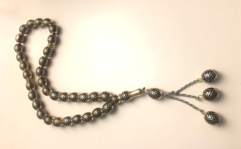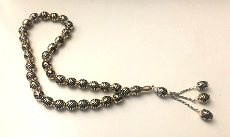Le chapelet est fait de grosses perles dorées avec jolies décorations, on peut par exemple utiliser ce chapelet pour la formule classique où il faut dire : 33 fois "Subhan-Allah" puis 33 fois "Al-Hamdoulillah" puis 33 fois "Allahu-Akbar".