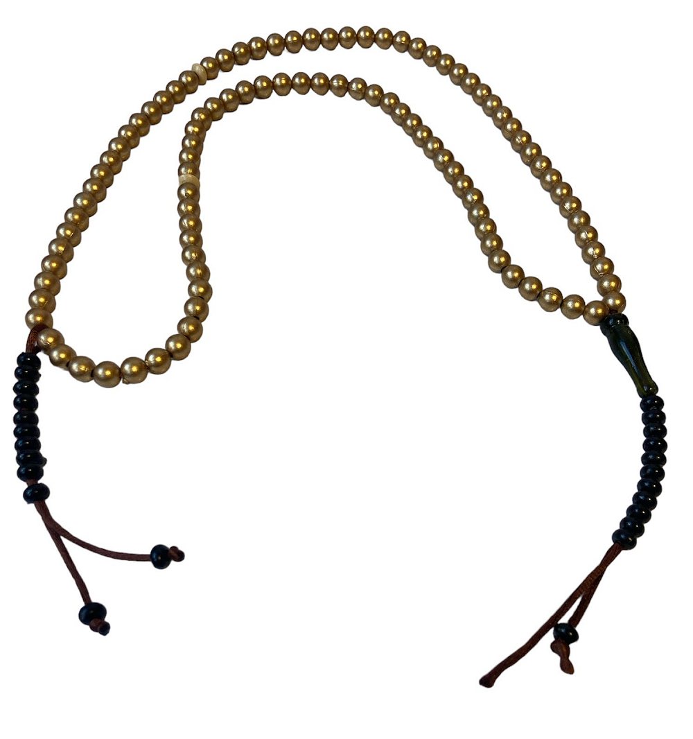 Chapelet dore (Sabha) a 99 perles dorees avec 2 separateurs blancs plats et 2 pompons-compteurs