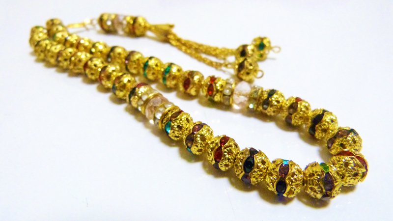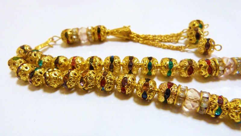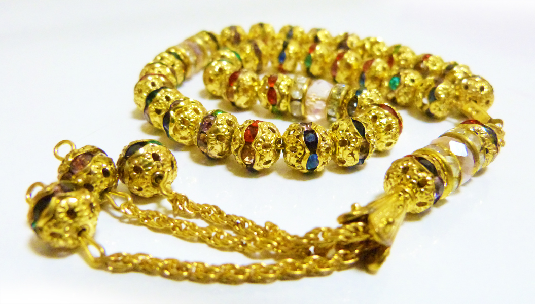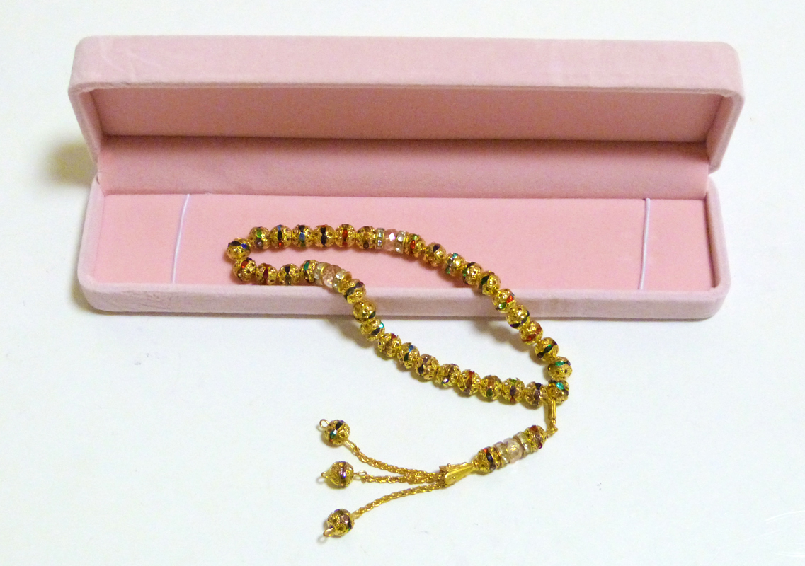 Très beau chapelet (sebha) de 33 grains métalliques dorés et sertis de cristaux multicolores, présenté dans un joli boitier recouvert de velours rose.
