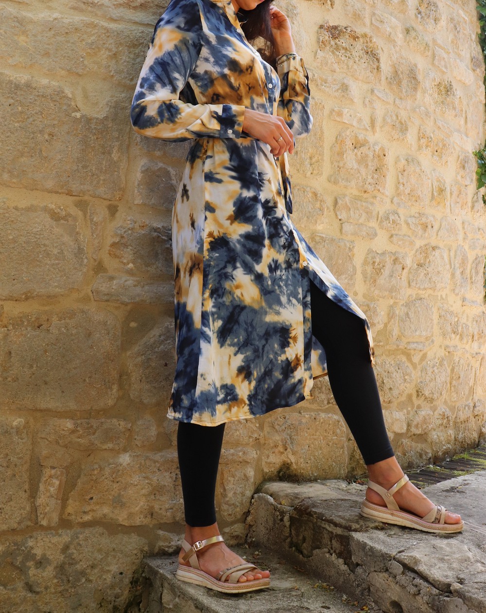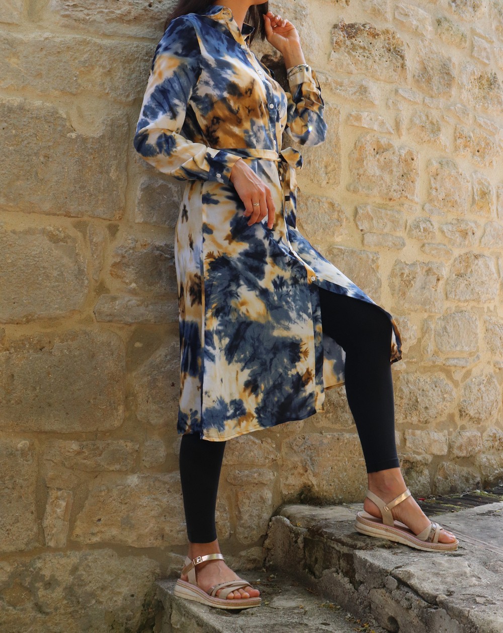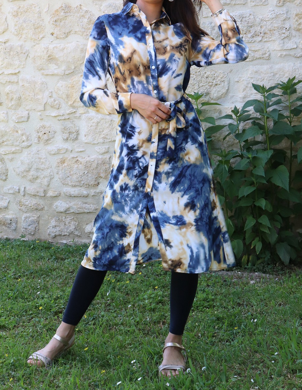 Chemise Tunique longue imprimee avec ceinture assortie - Couleur bleu et jaune