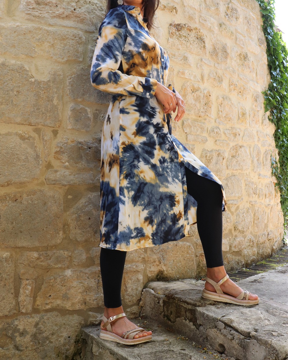 Chemise Tunique longue imprimée avec ceinture assortie - Couleur bleu et jaune Vetement & Accessoire