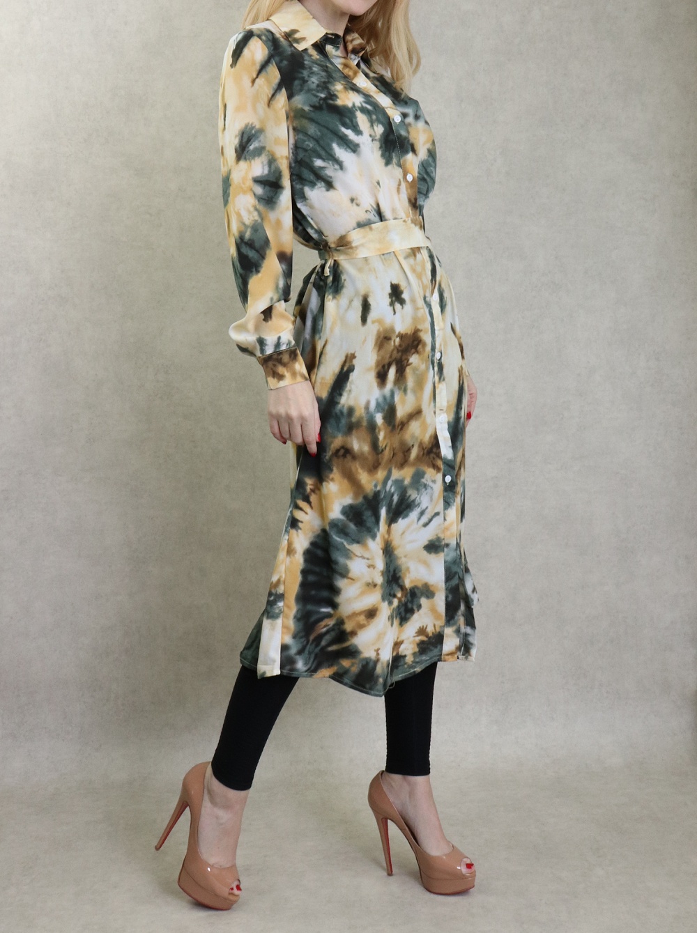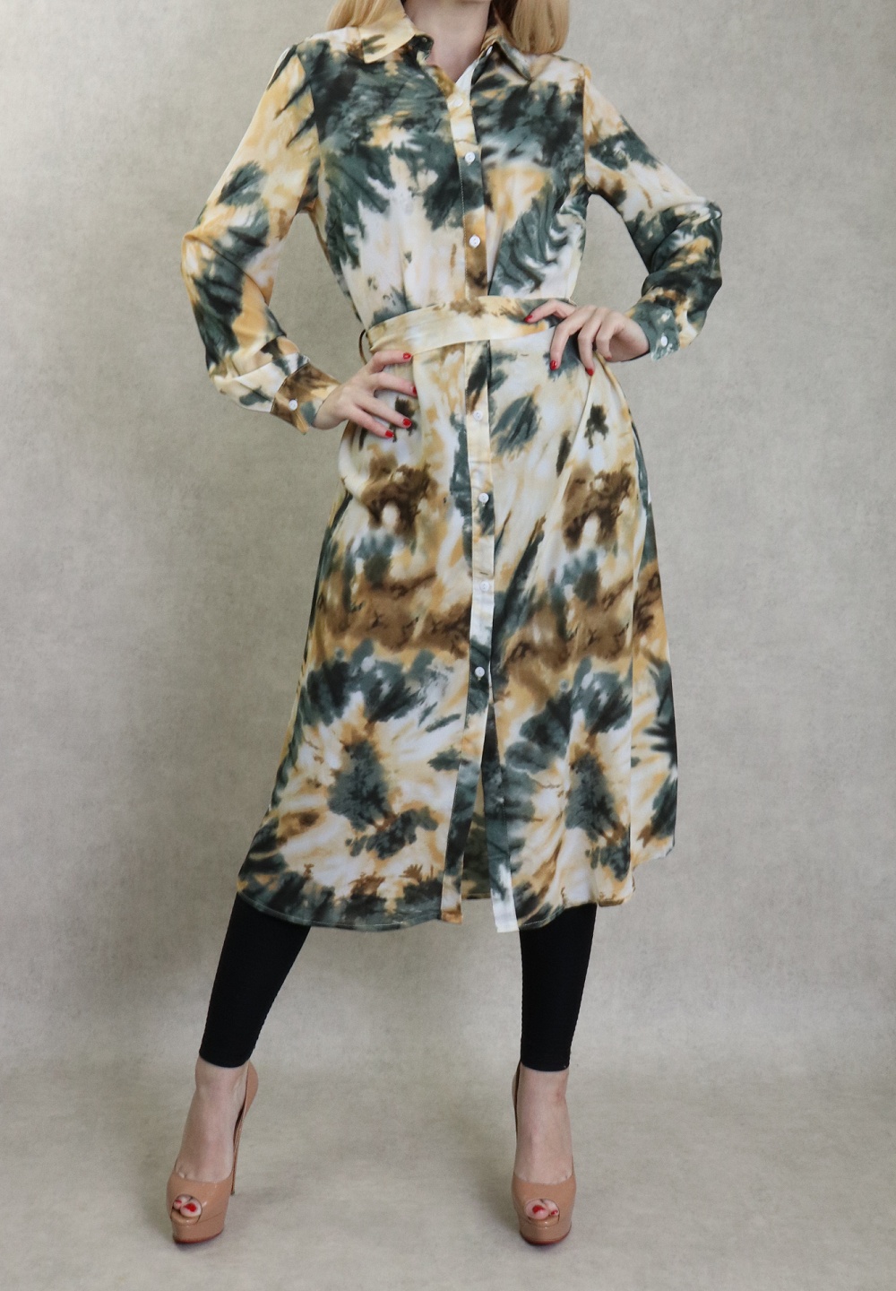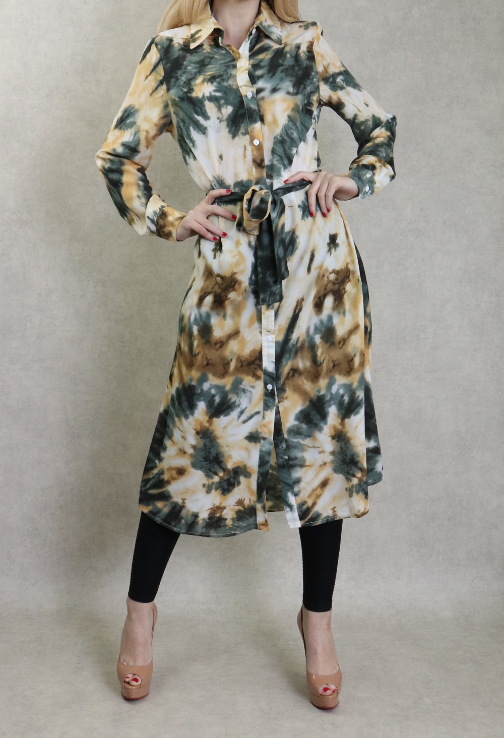 Chemise longue, col chemise, manches finition boutons aux poignets, coupe droite, fermeture boutons, ceinture assortie, tissu léger. Ce modèle reste un basique et indémodable qui se porte en toute saison et diverses occasions.