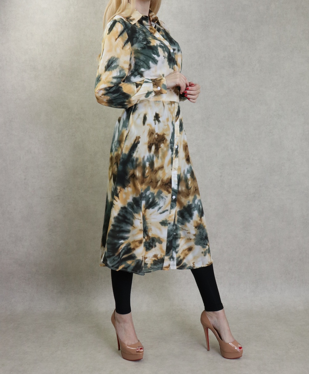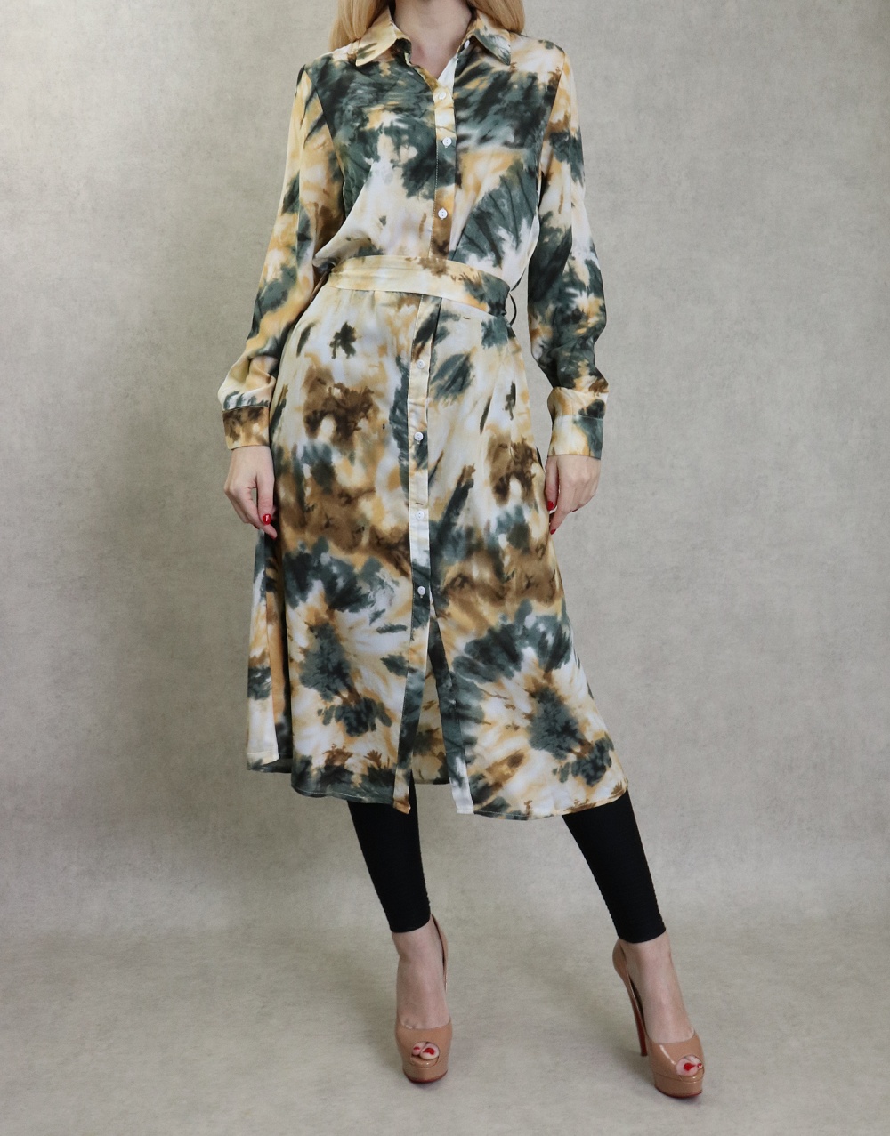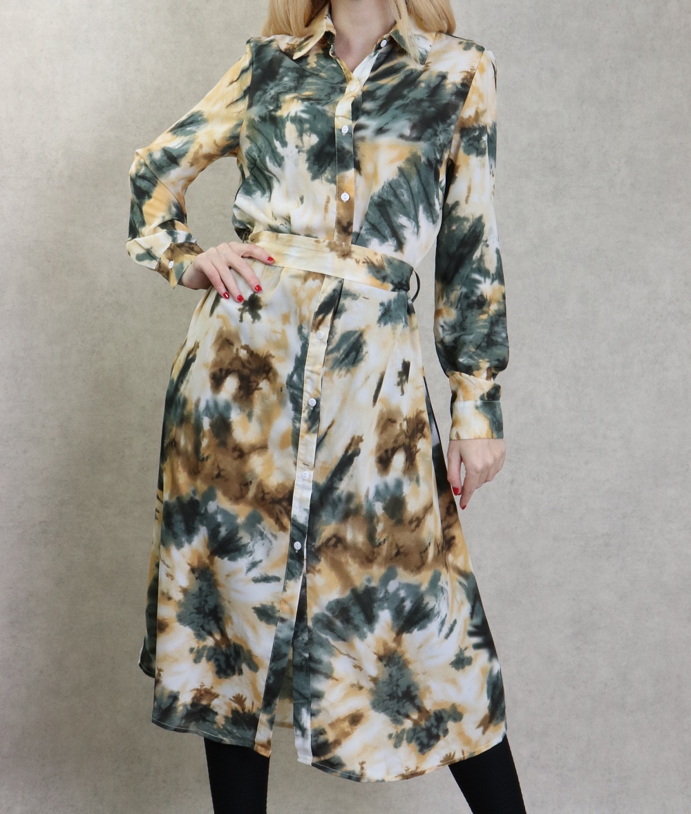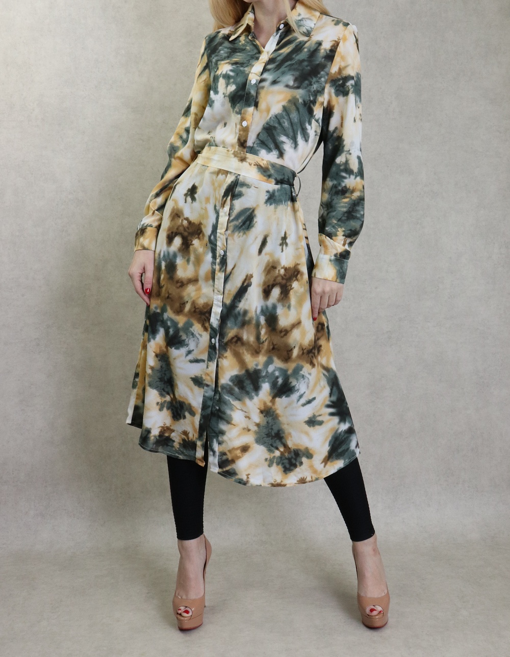 Chemise longue, col chemise, manches finition boutons aux poignets, coupe droite, fermeture boutons, ceinture assortie, tissu léger. Ce modèle reste un basique et indémodable qui se porte en toute saison et diverses occasions.