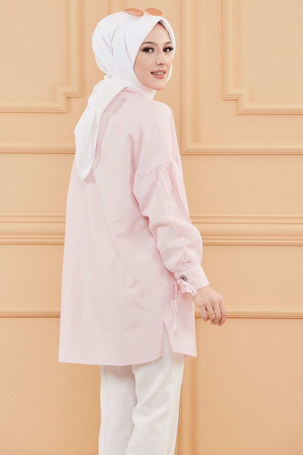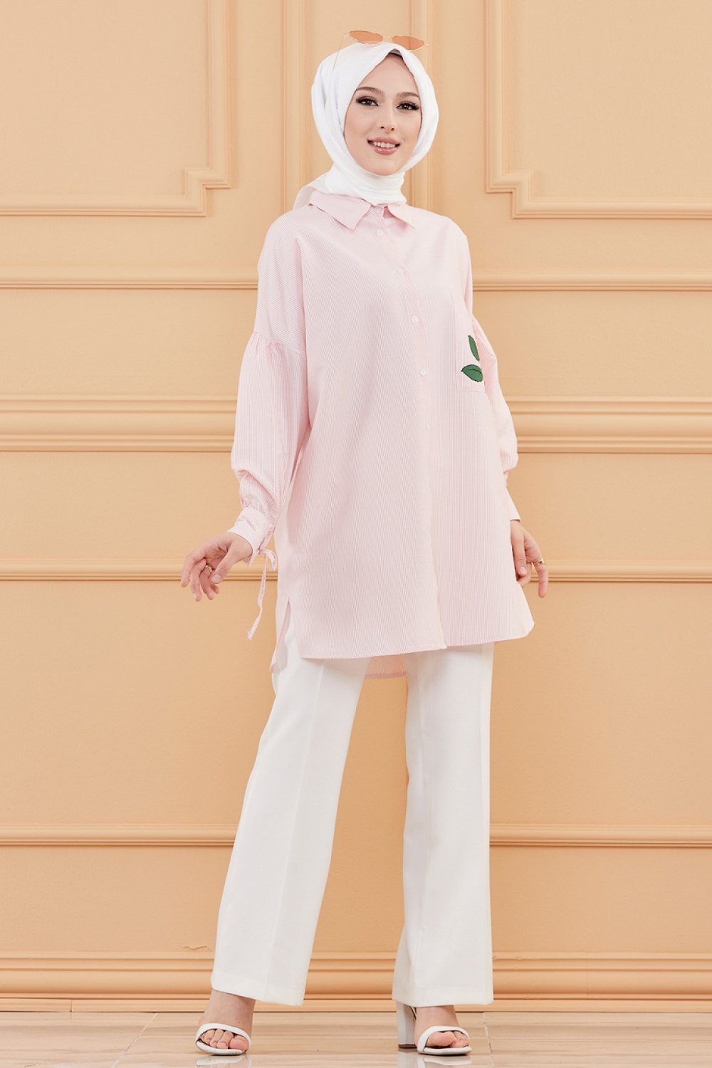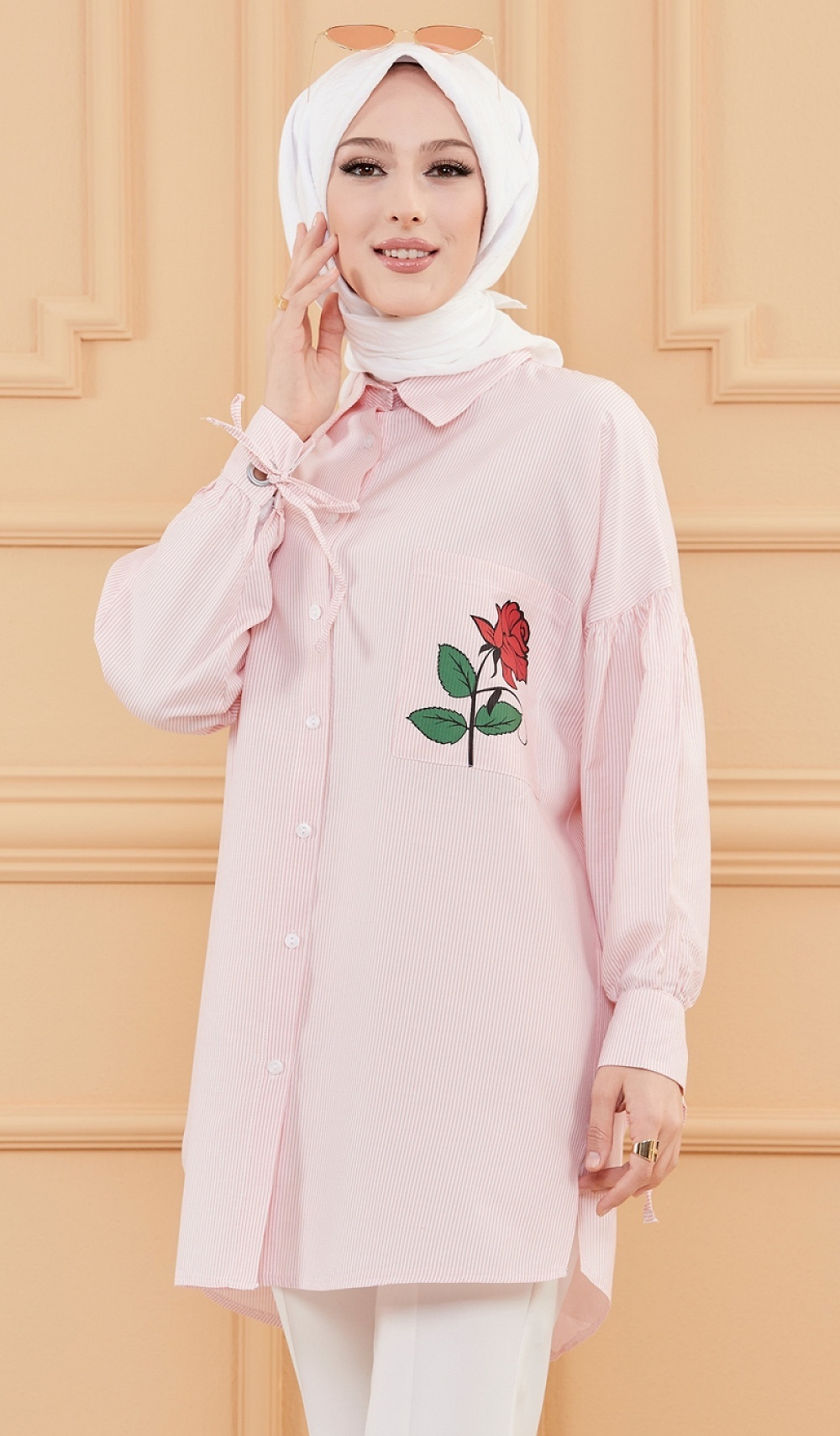 Chemise-Tunique motif fleur (Vêtement pour femme voilée) - Couleur des rayures : rose poudré Vetement & Accessoire