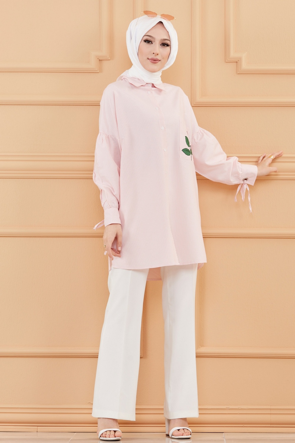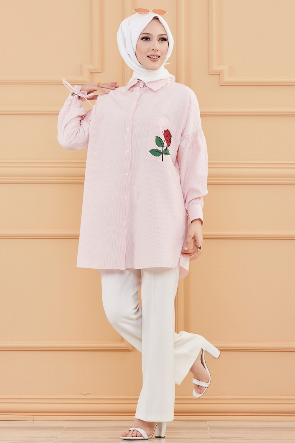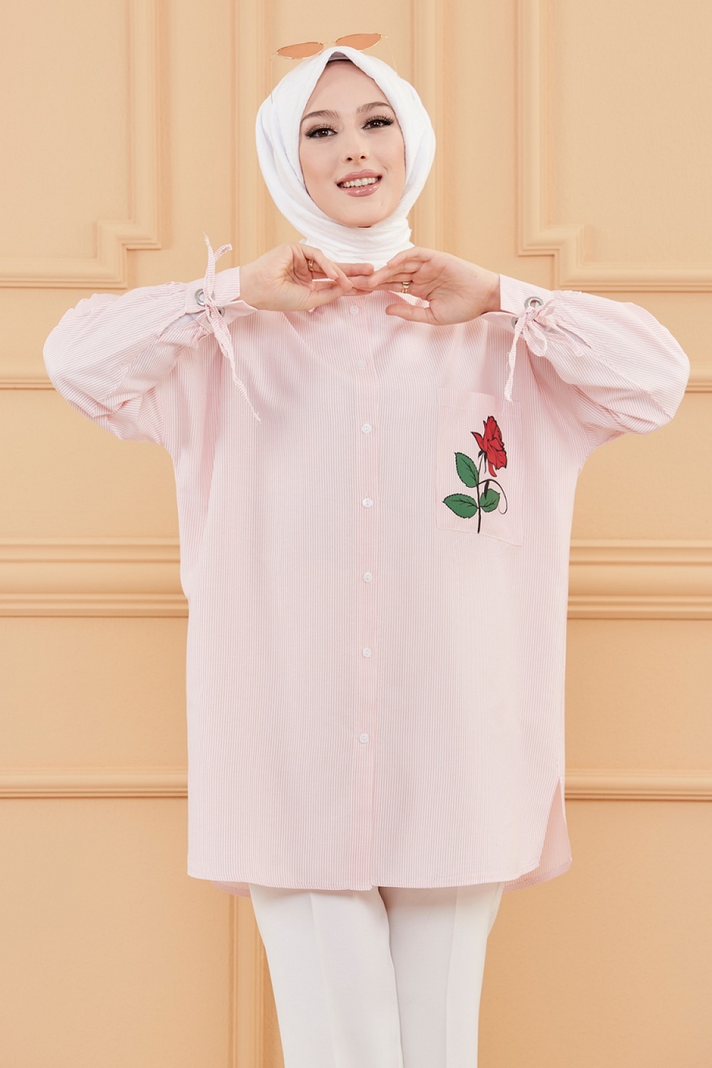 Chemise-Tunique motif fleur (Vetement pour femme voilee) - Couleur des rayures : rose poudre