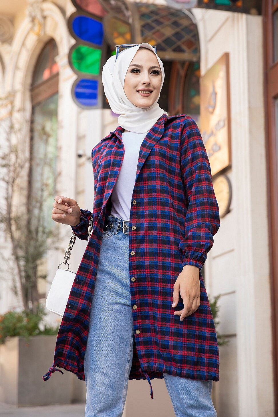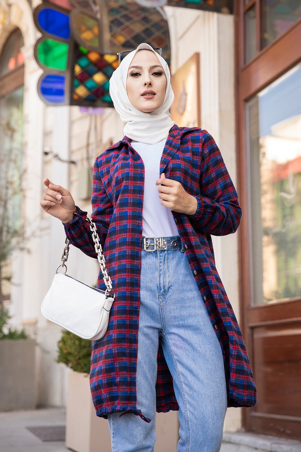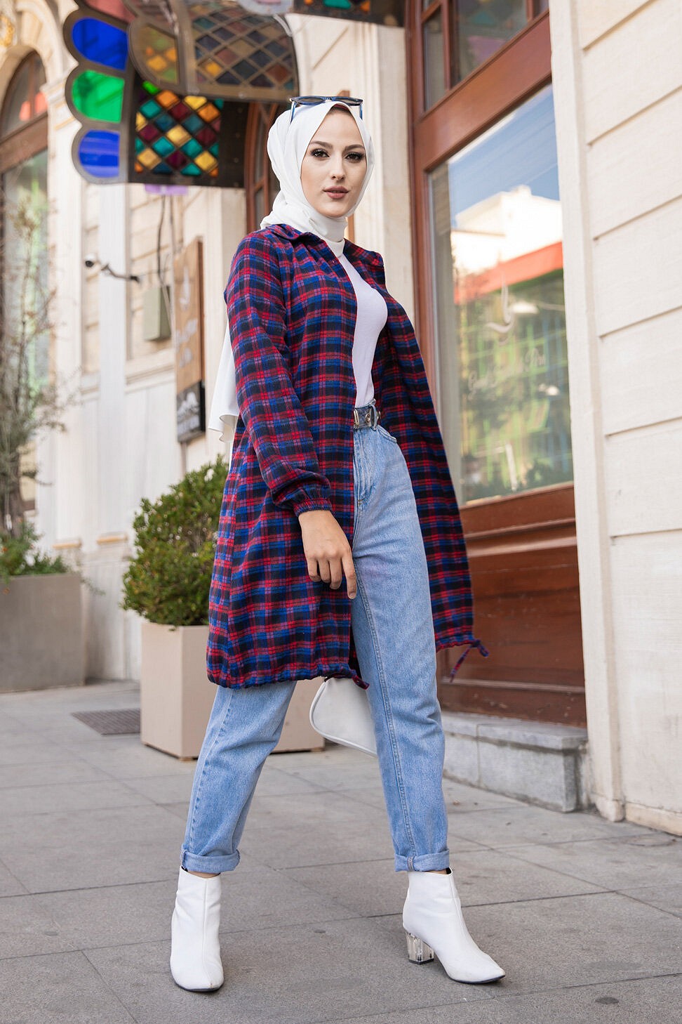 Chemise longue (Modest Fashion 2025 pas cher) - Tunique a carreaux bleu et rouge