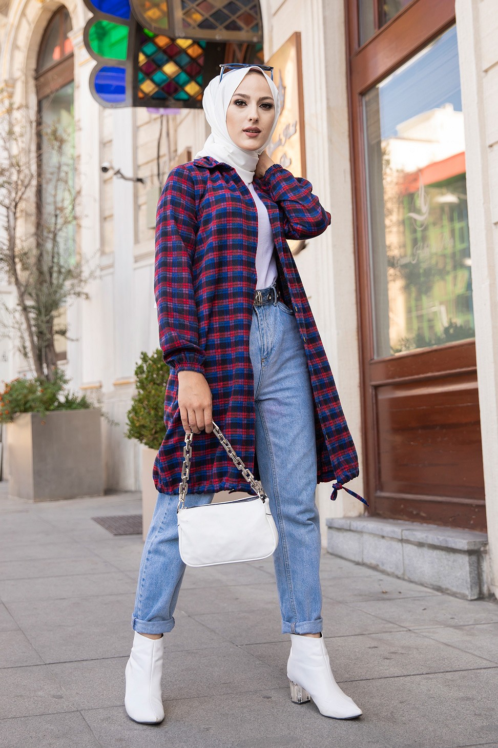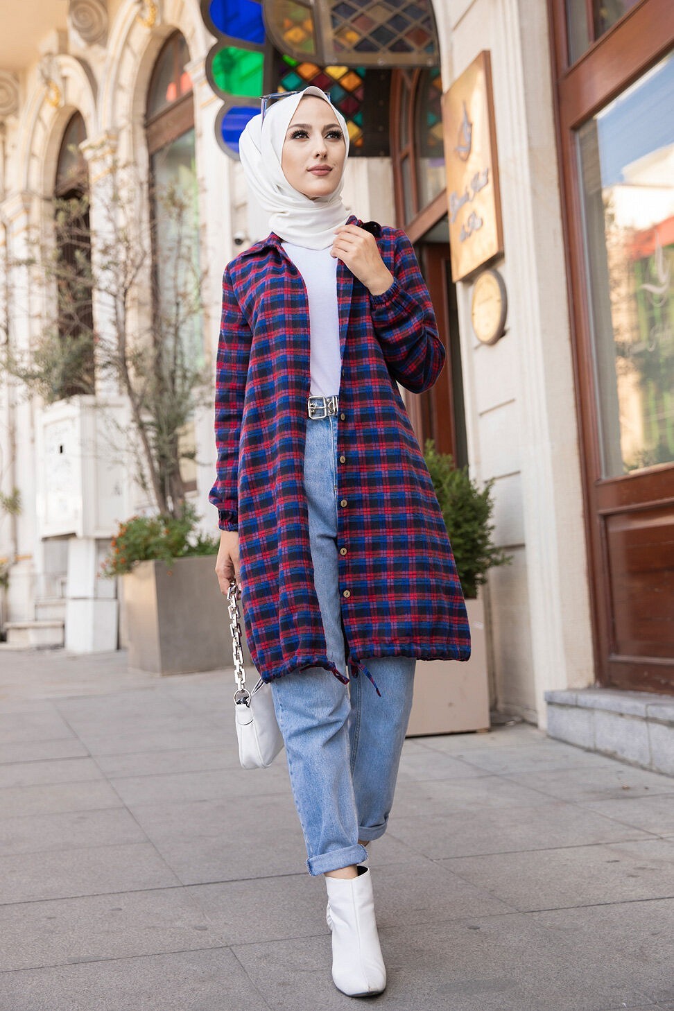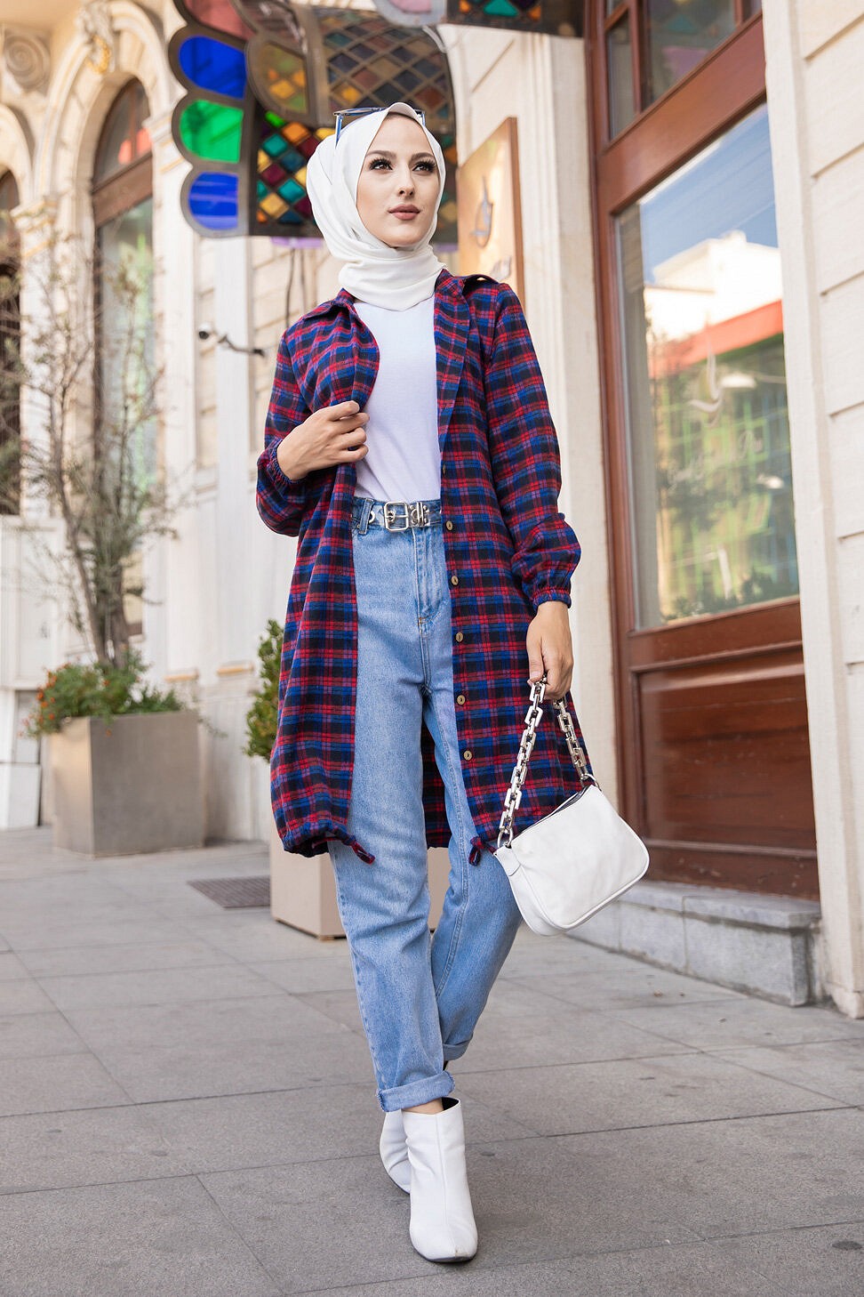 Chemise longue (Modest Fashion 2025 pas cher) - Tunique a carreaux bleu et rouge
