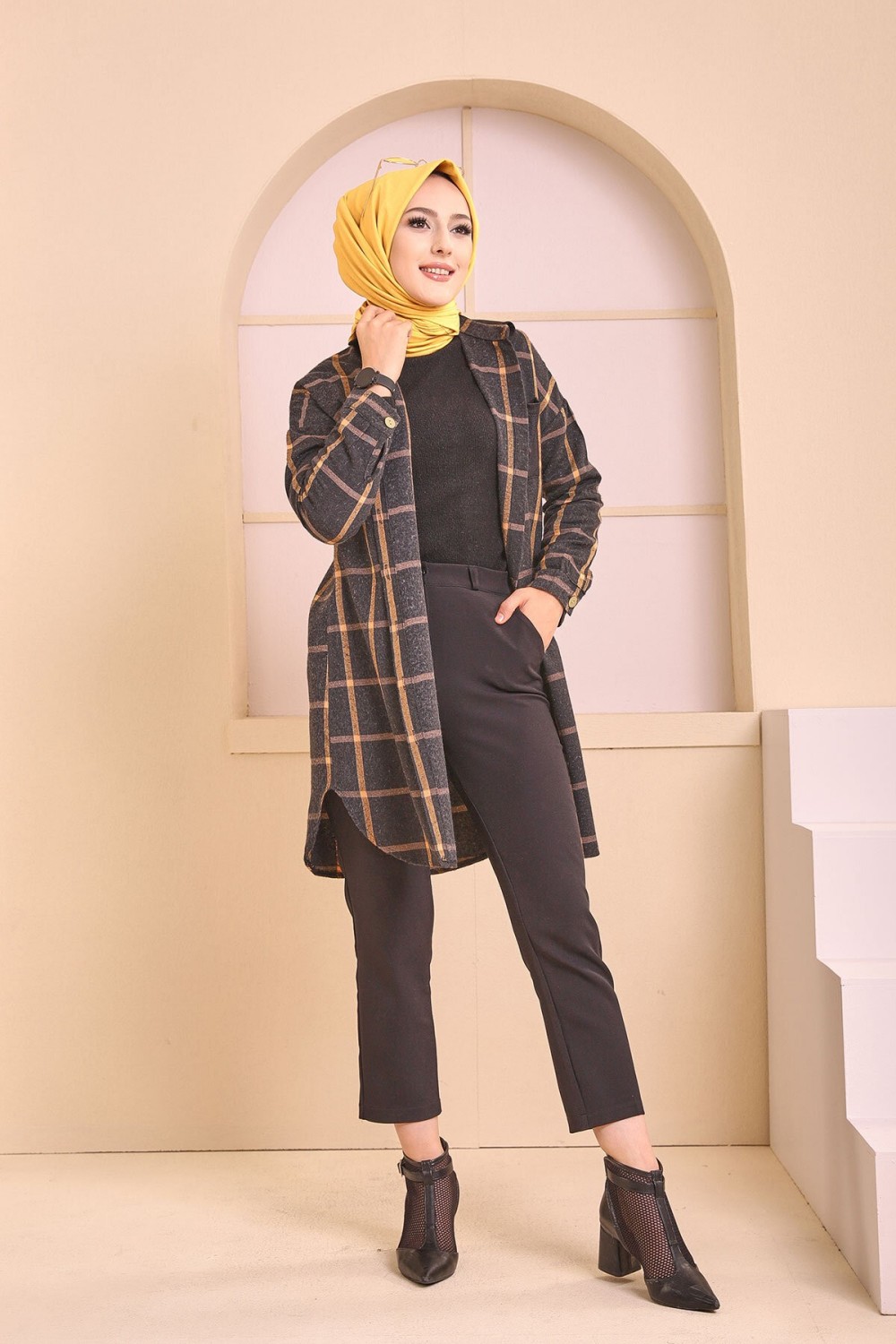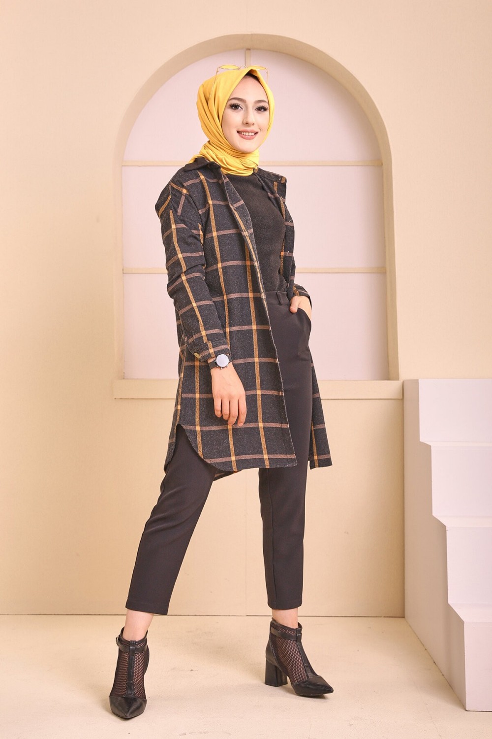 Chemise longue à carreaux pour femme (Vêtement musulmane Paris) - Couleur anthracite et écru - REF. 38332 (24.90 €)