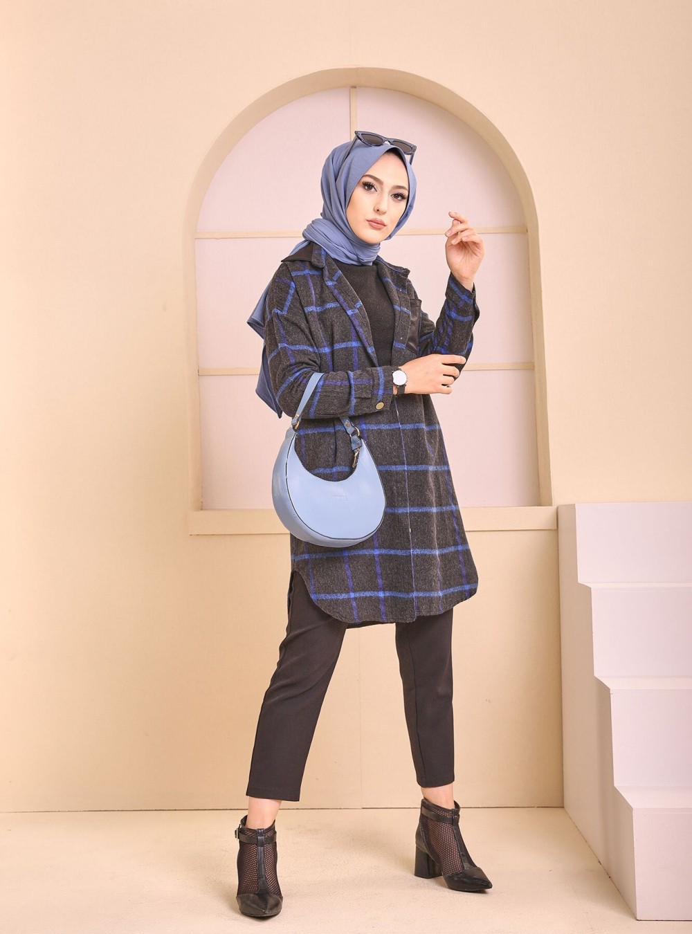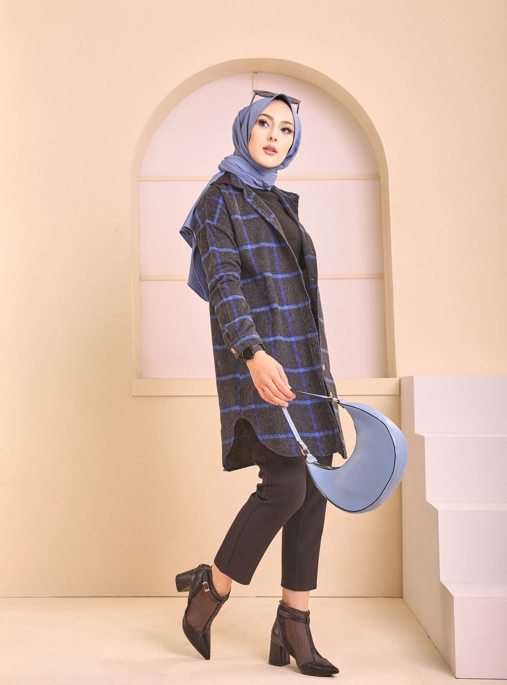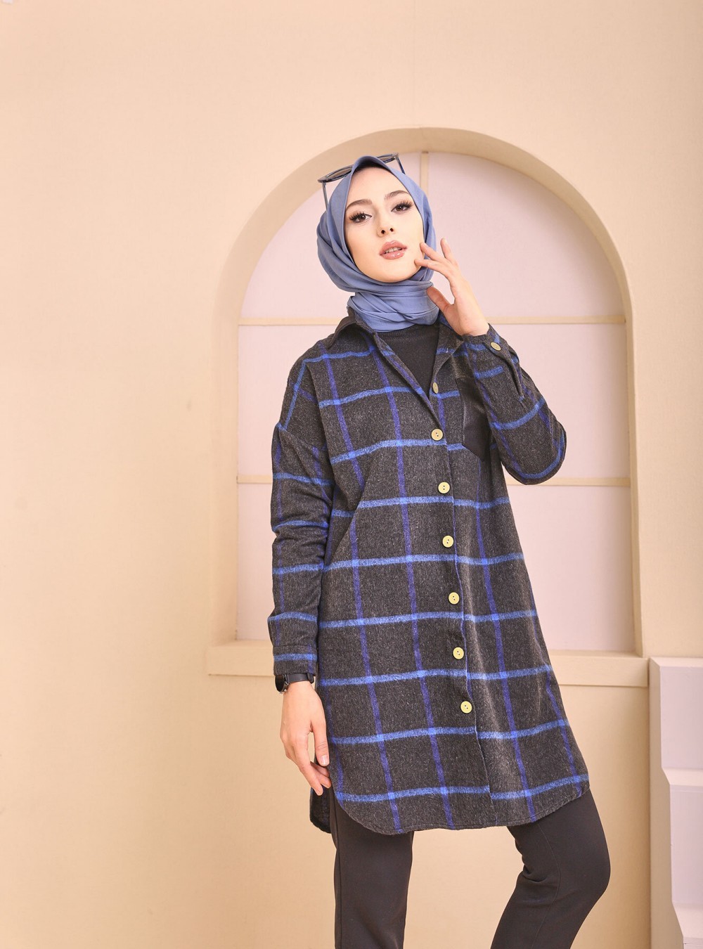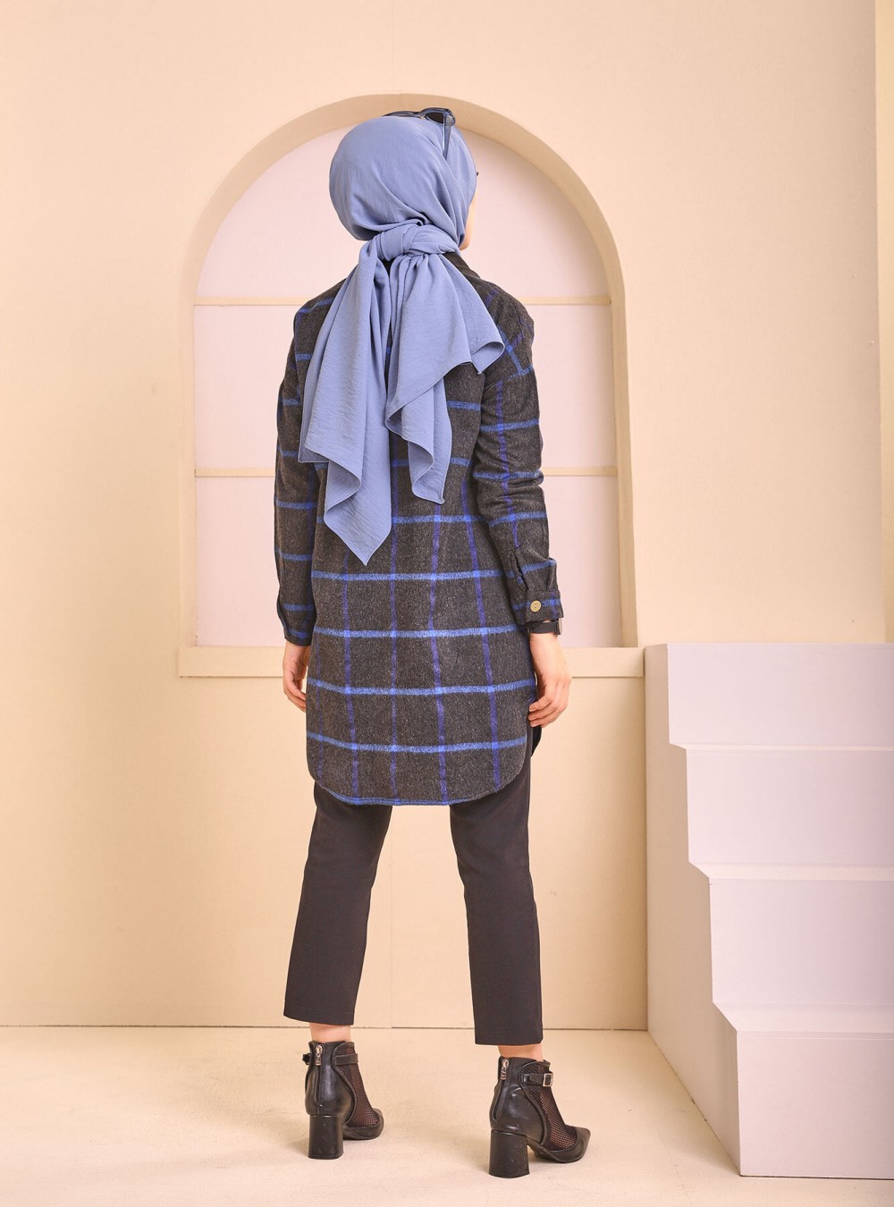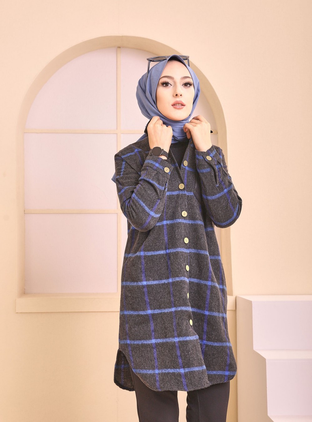 Chemise longue à carreaux pour femme (Boutique Vêtement moderne pour musulmane) - Couleur bleu écru - REF. 38330 (24.90 €)