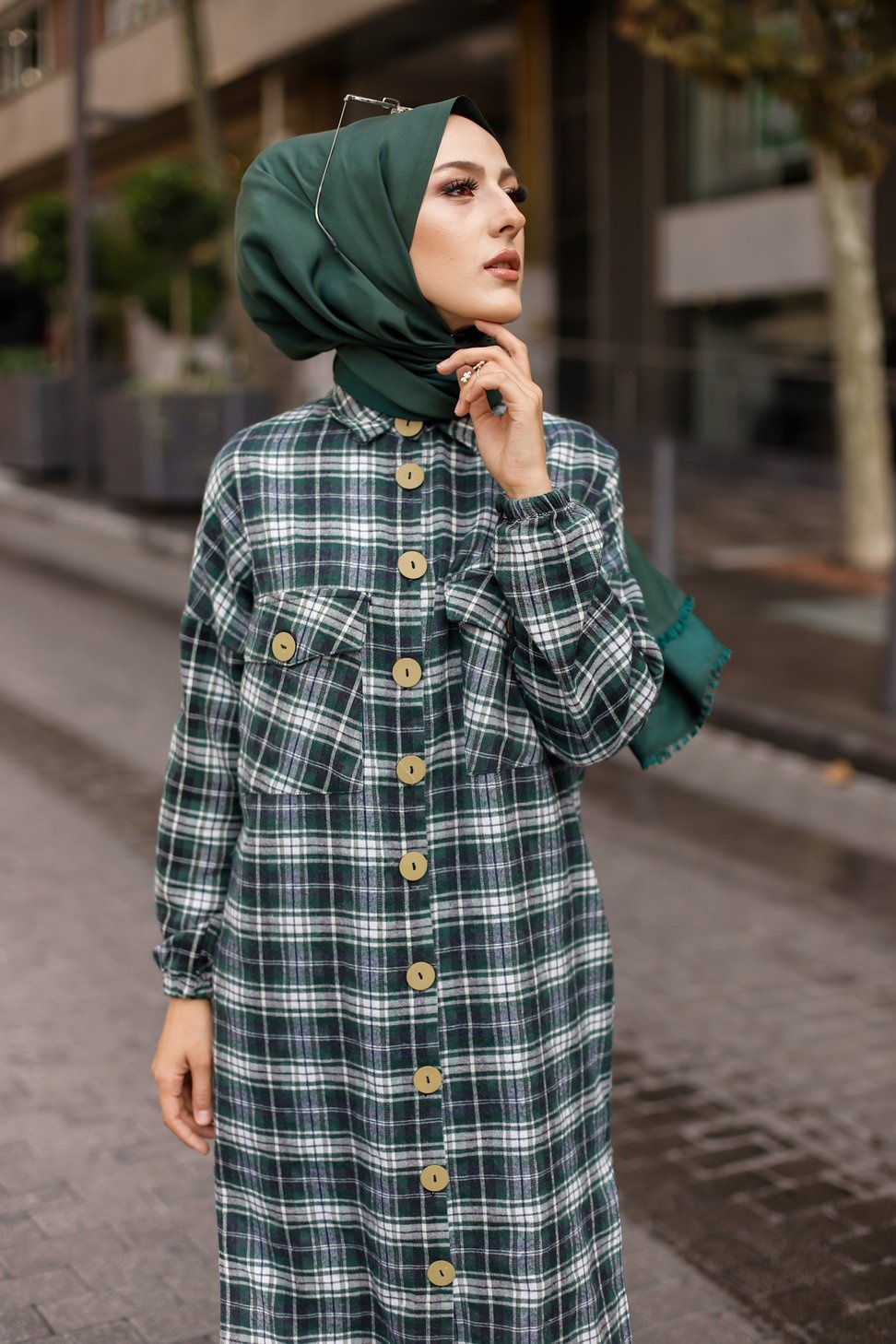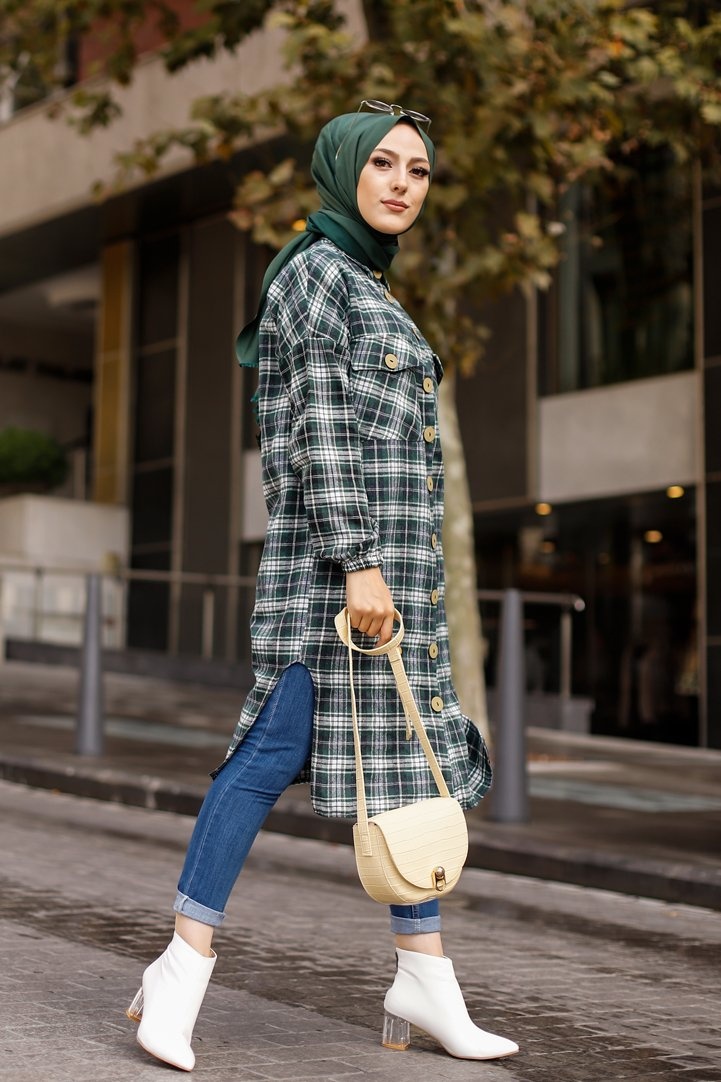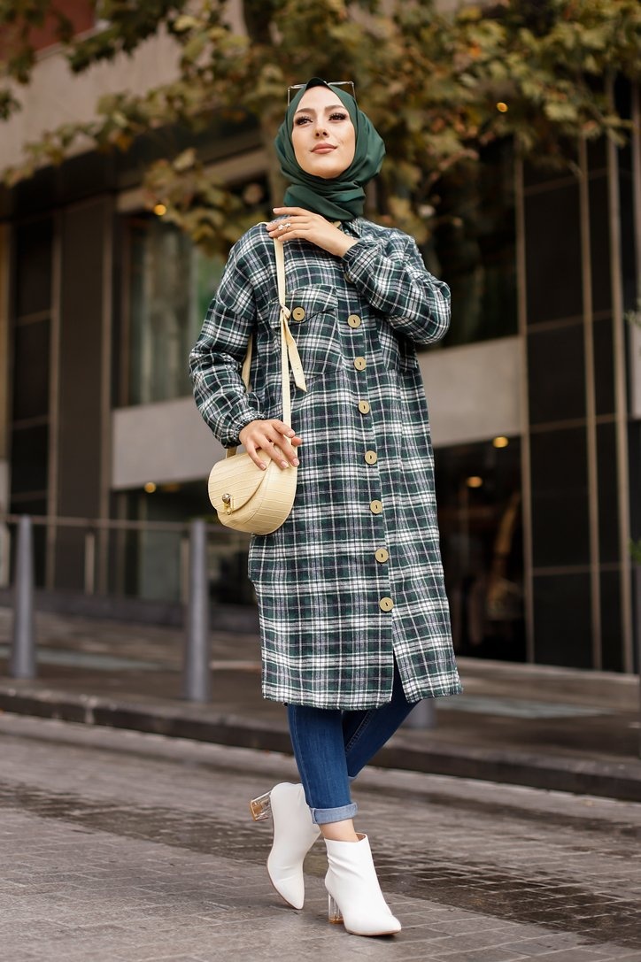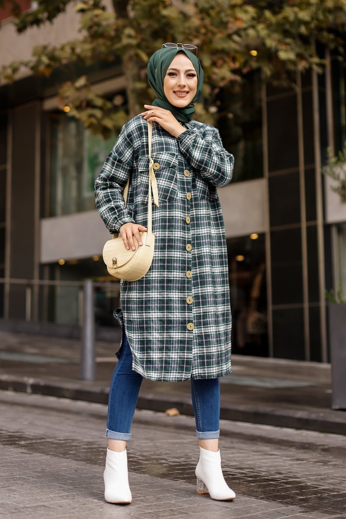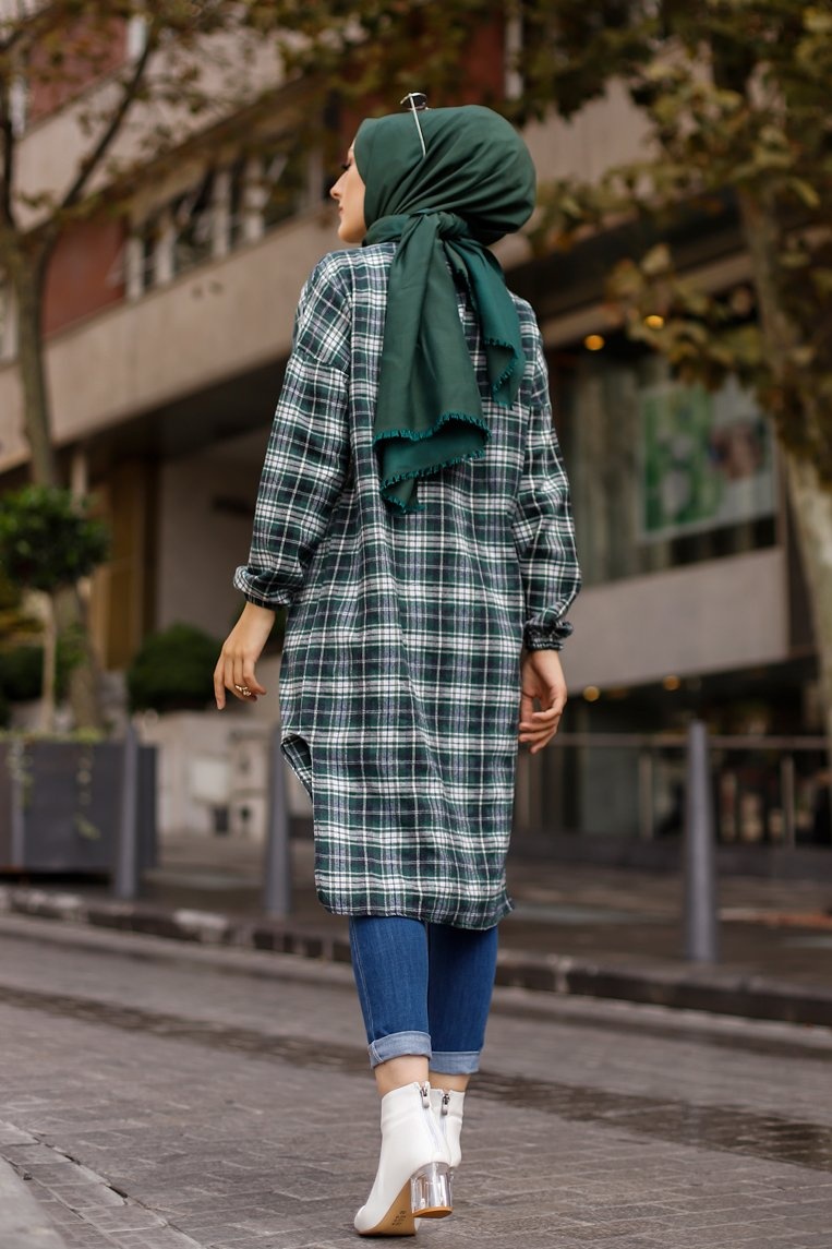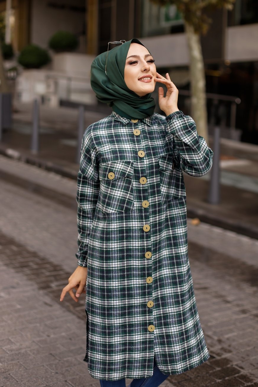 Chemise longue a carreaux (Vetement pour musulmane tendance fashion 2025) - Couleur noir et vert