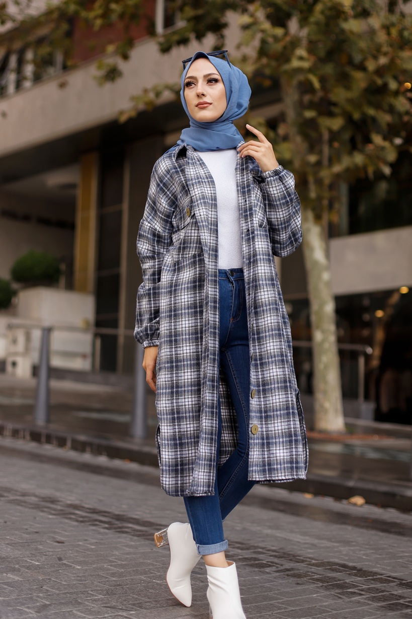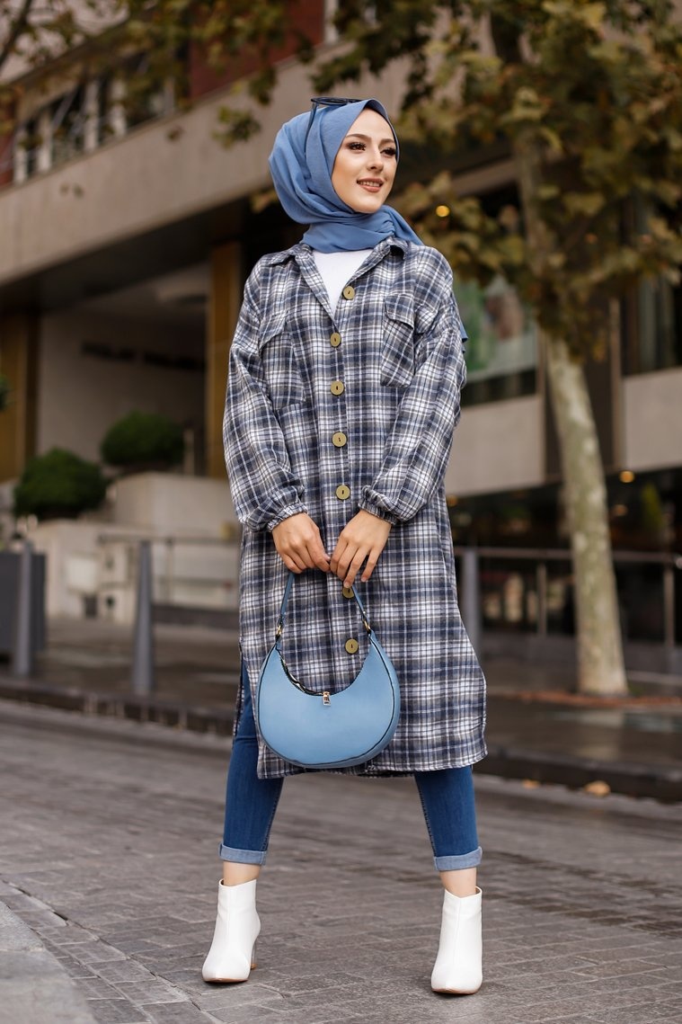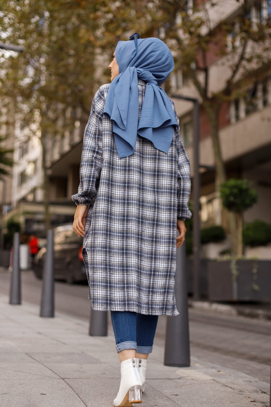 Chemise longue à carreaux pour femme (Boutique Vêtement moderne pour musulmane) - Couleur bleu écru Vetement & Accessoire