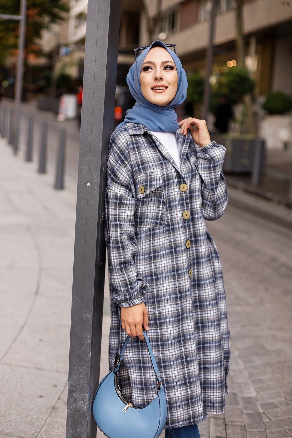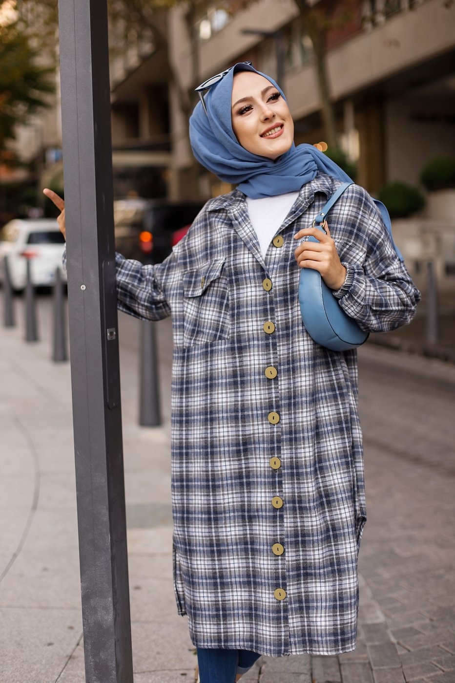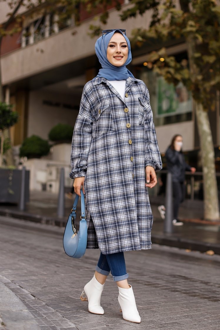 Chemise longue à carreaux pour femme (Boutique Vêtement moderne pour musulmane) - Couleur bleu écru Vetement & Accessoire