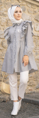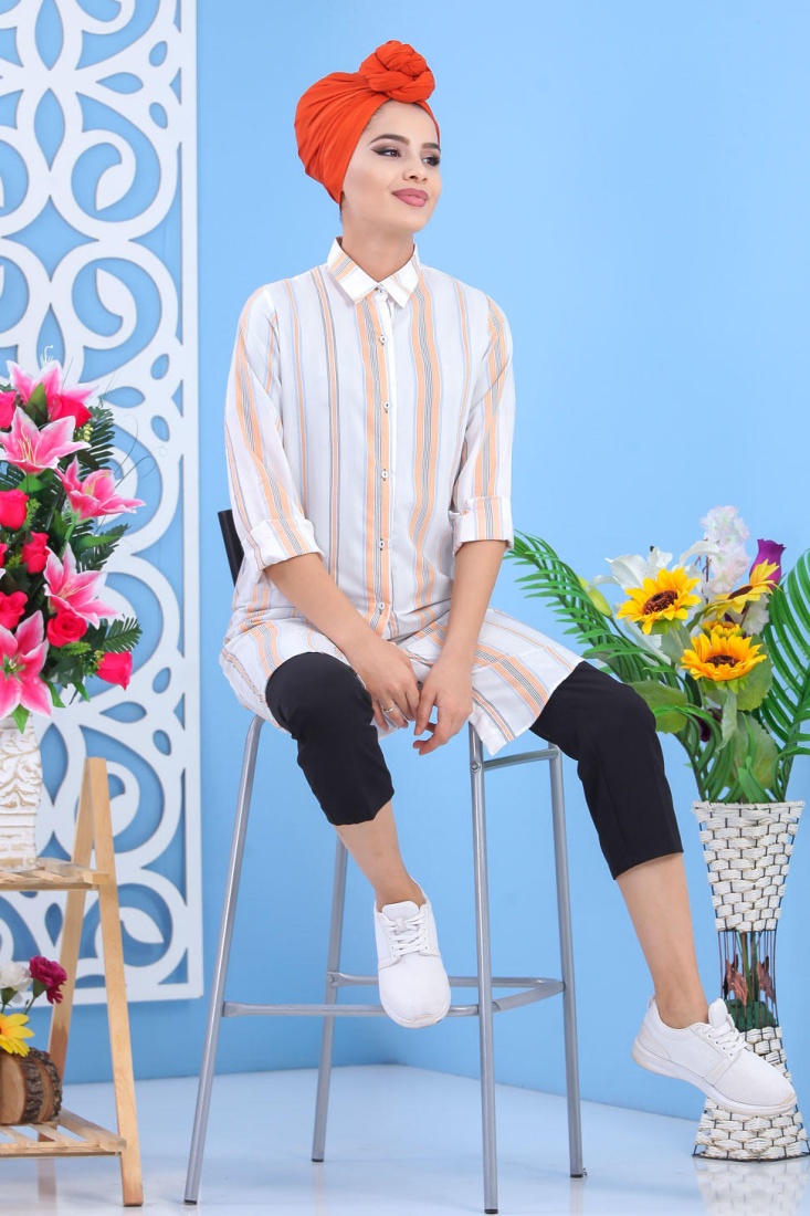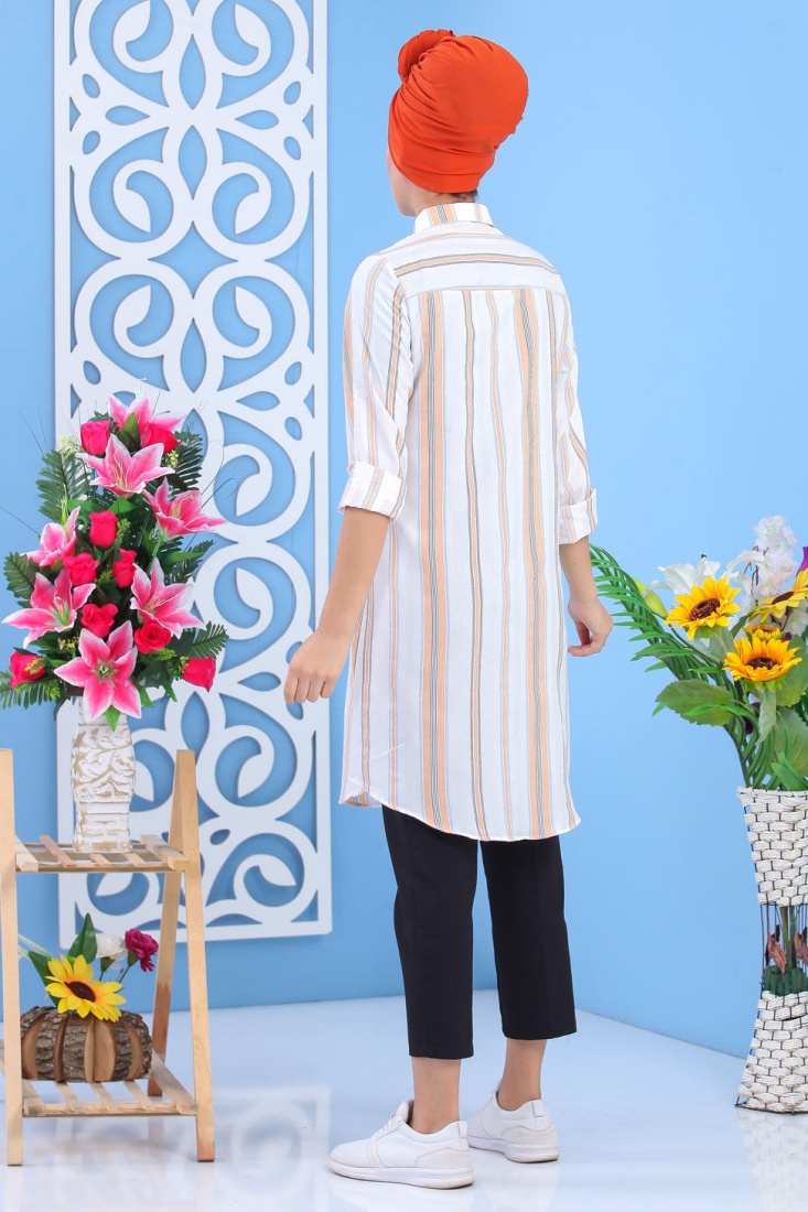 Chemise longue, col chemise, manches finition boutons aux poignets, coupe légèrement évasée, extrémités arrondies, tissu léger. Ce modèle reste un basique et indémodable qui se porte en toute saison et diverses occasions.