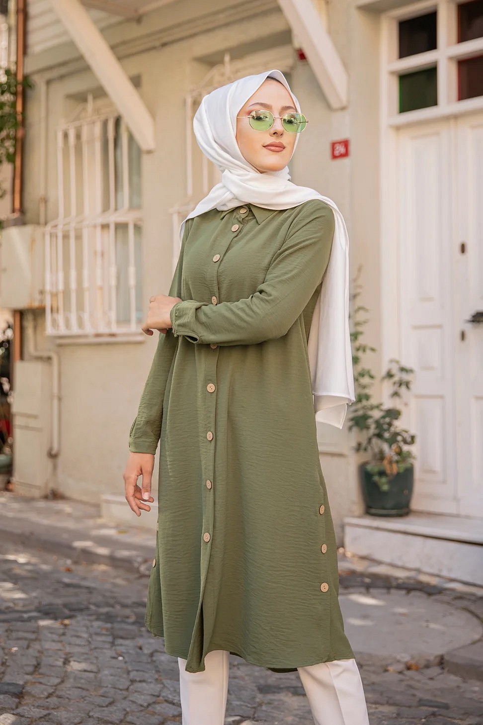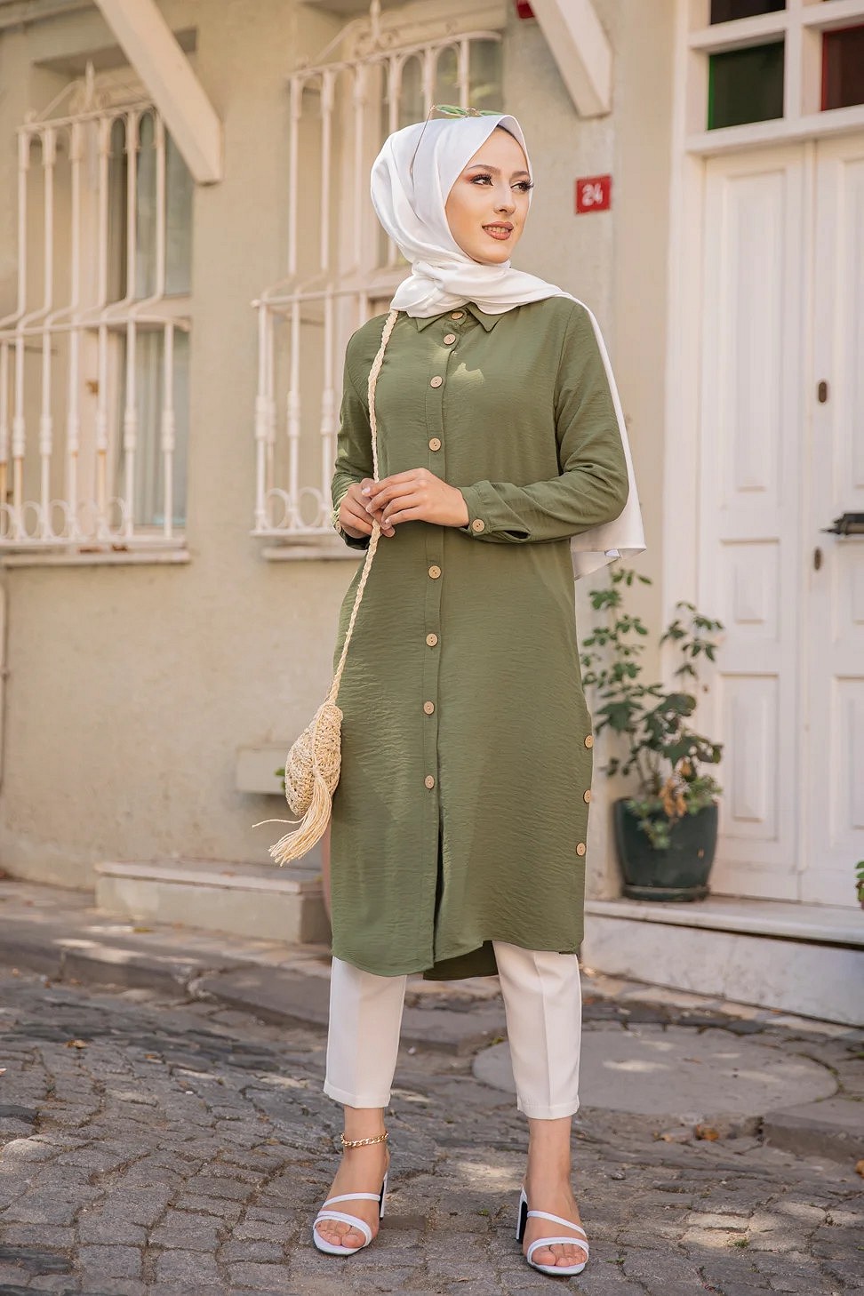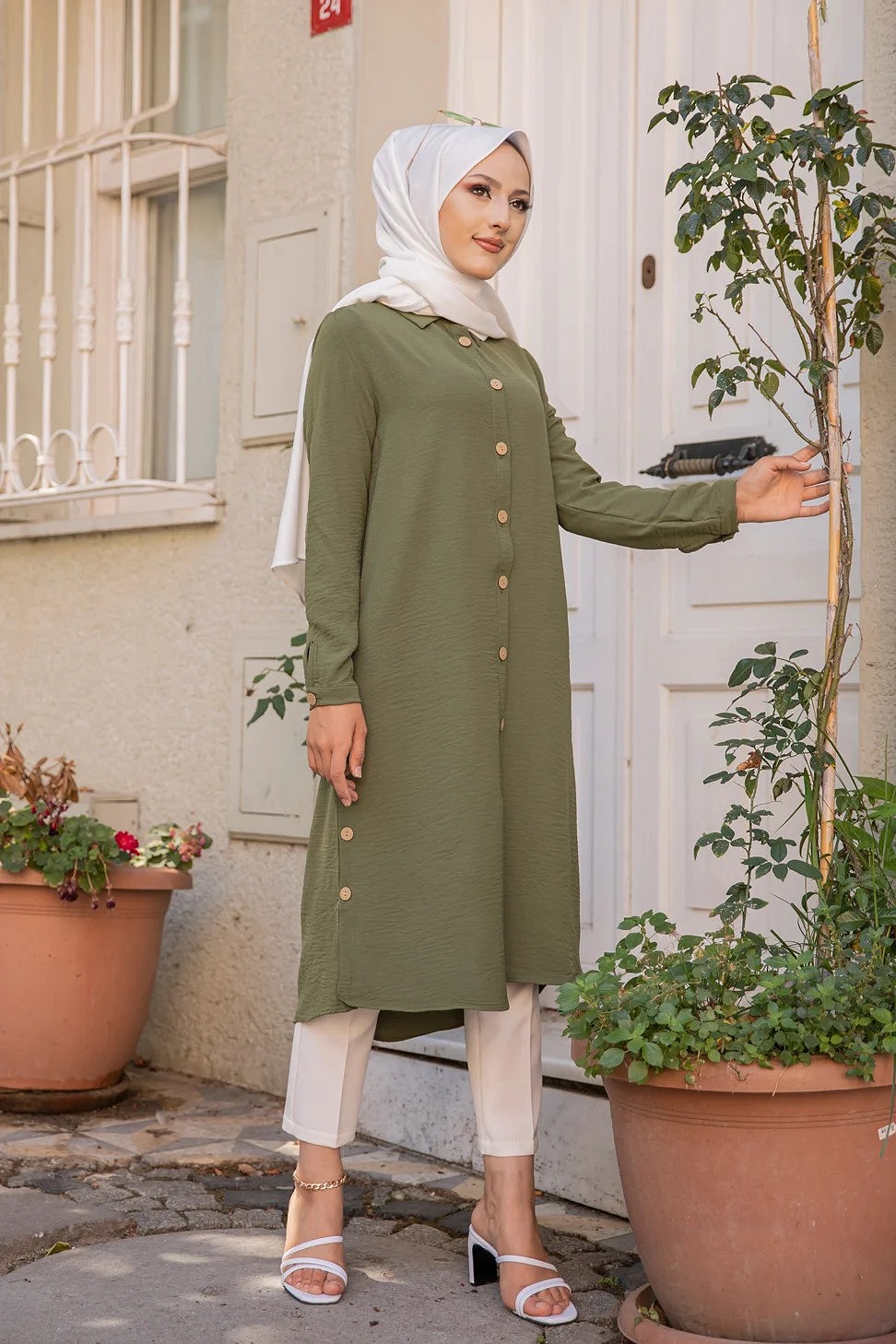 Chemise longue boutonnée type tunique (Vetement pudique femme voilée) - Couleur kaki Vetement & Accessoire