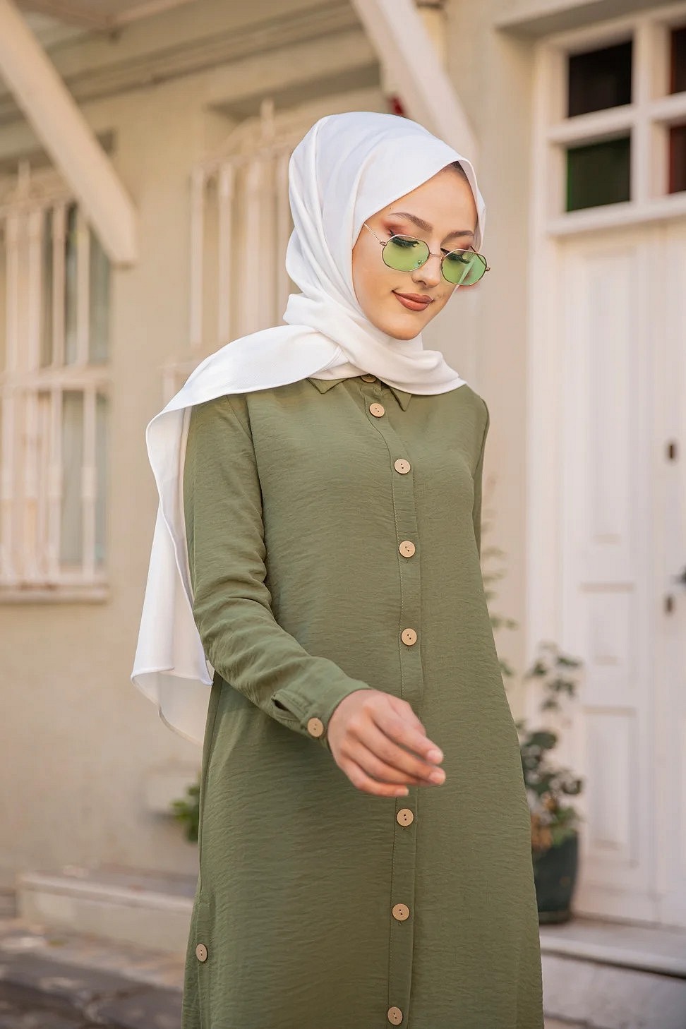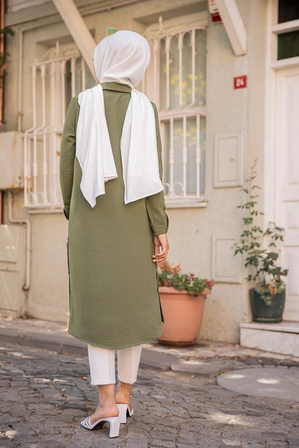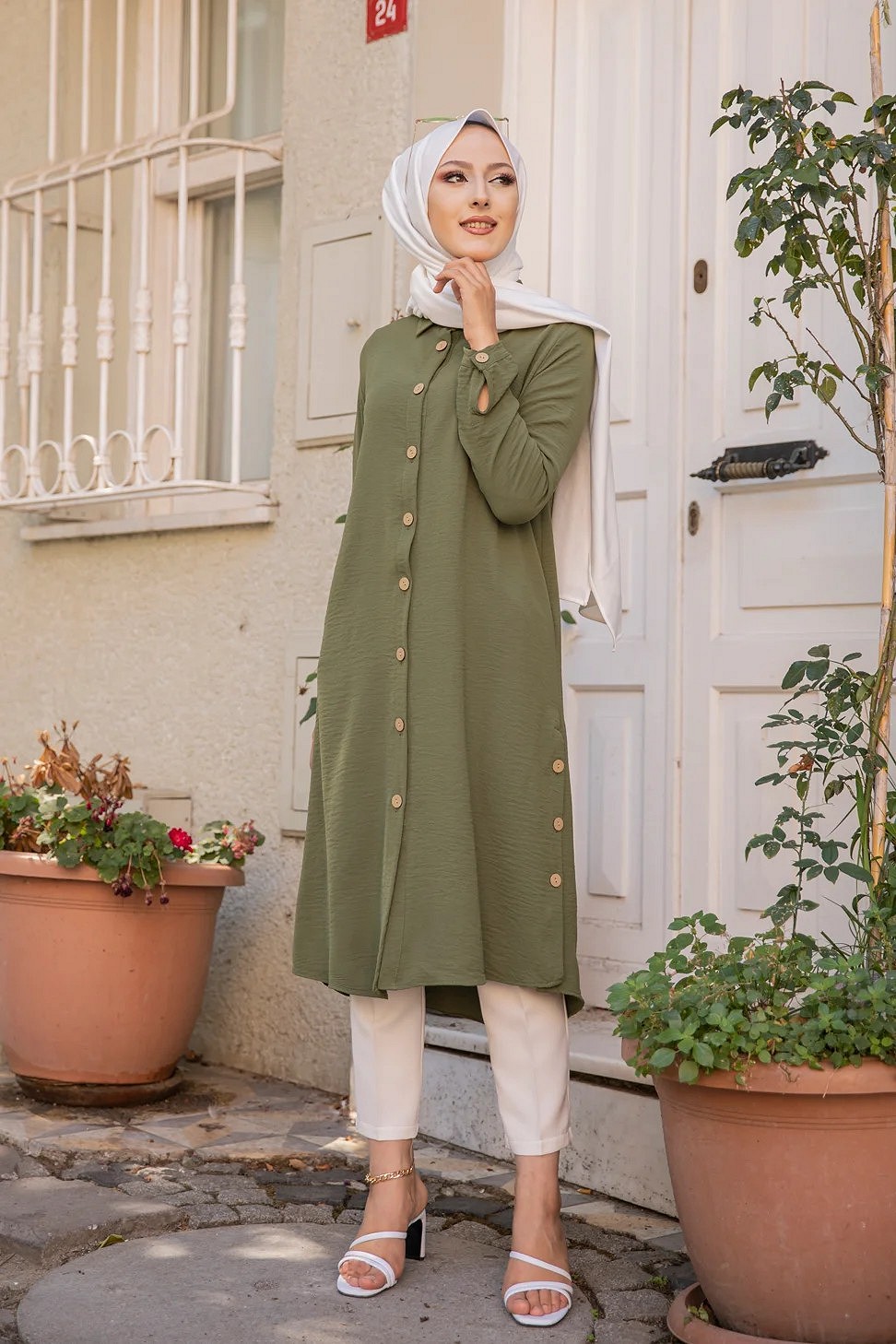 Chemise longue boutonnée type tunique (Vetement pudique femme voilée) - Couleur kaki Vetement & Accessoire