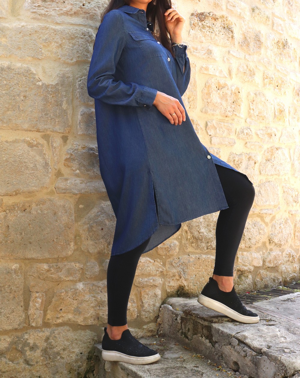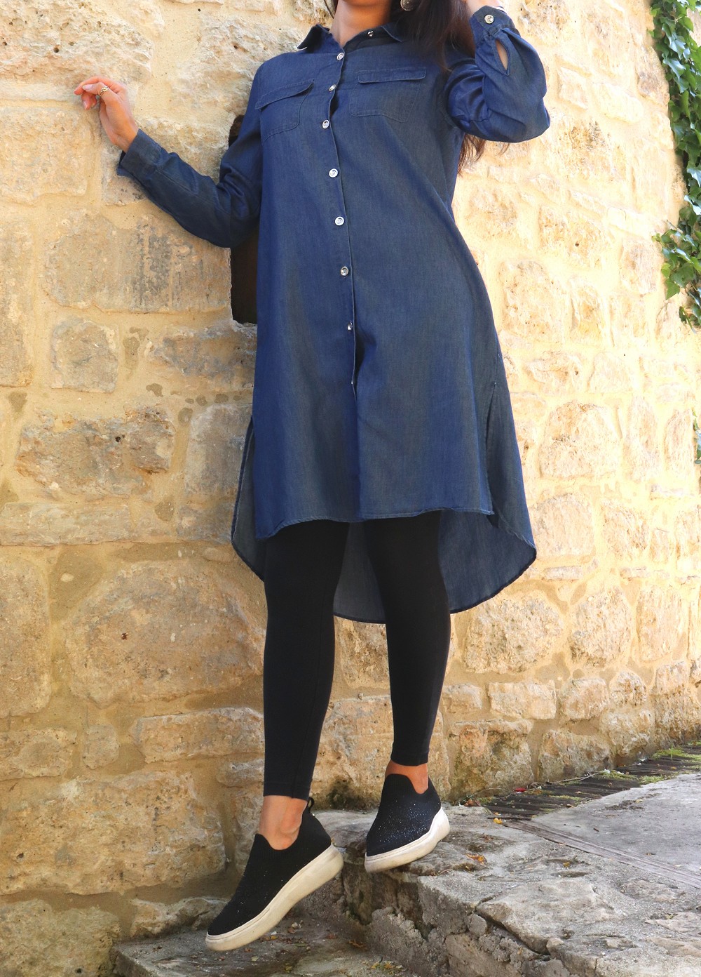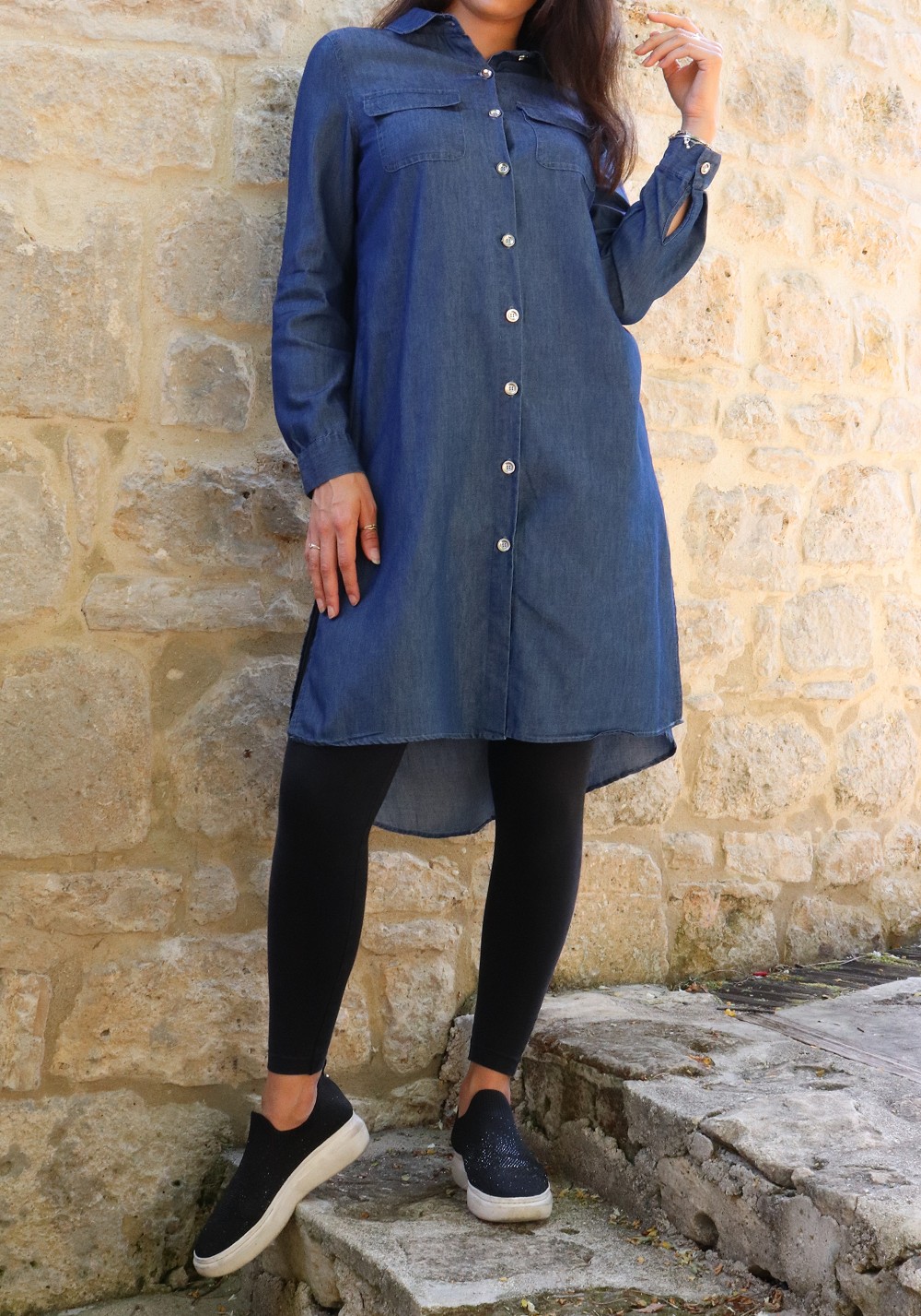Chemise longue décontractée en denim pour femme - Couleur bleu jean foncé Vetement & Accessoire