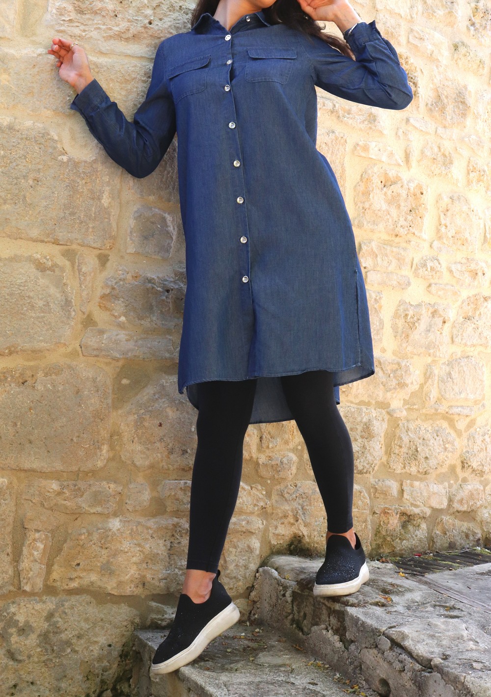Chemise longue look jean, col classique, manches longues. Coupe décontractée, fermeture frontale par boutons.