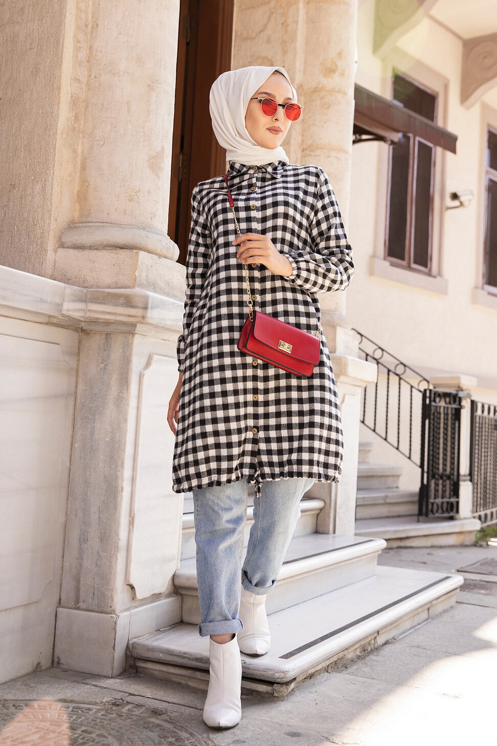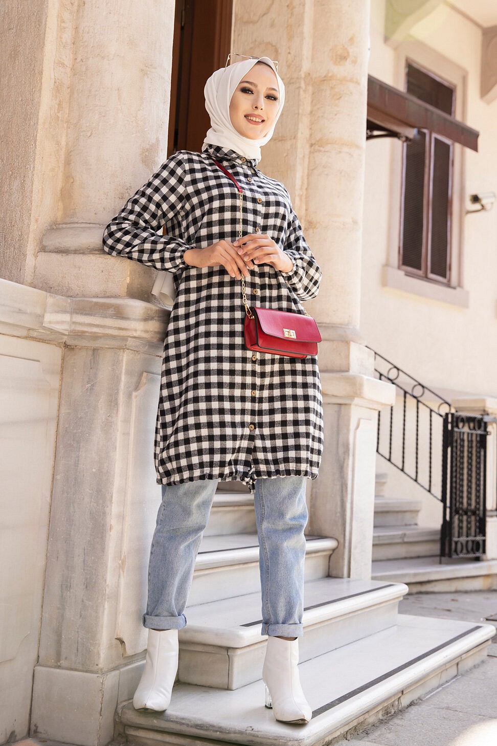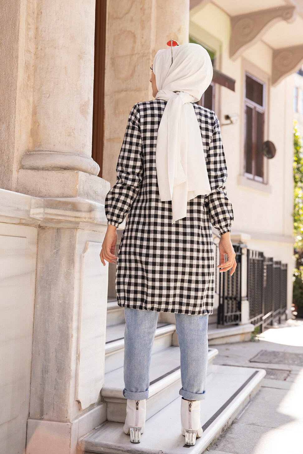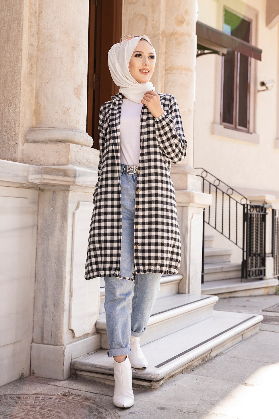 Ce modèle affiche un motif carreaux tendance. Il est idéal pour réchauffer une tenue à la mi-saison.