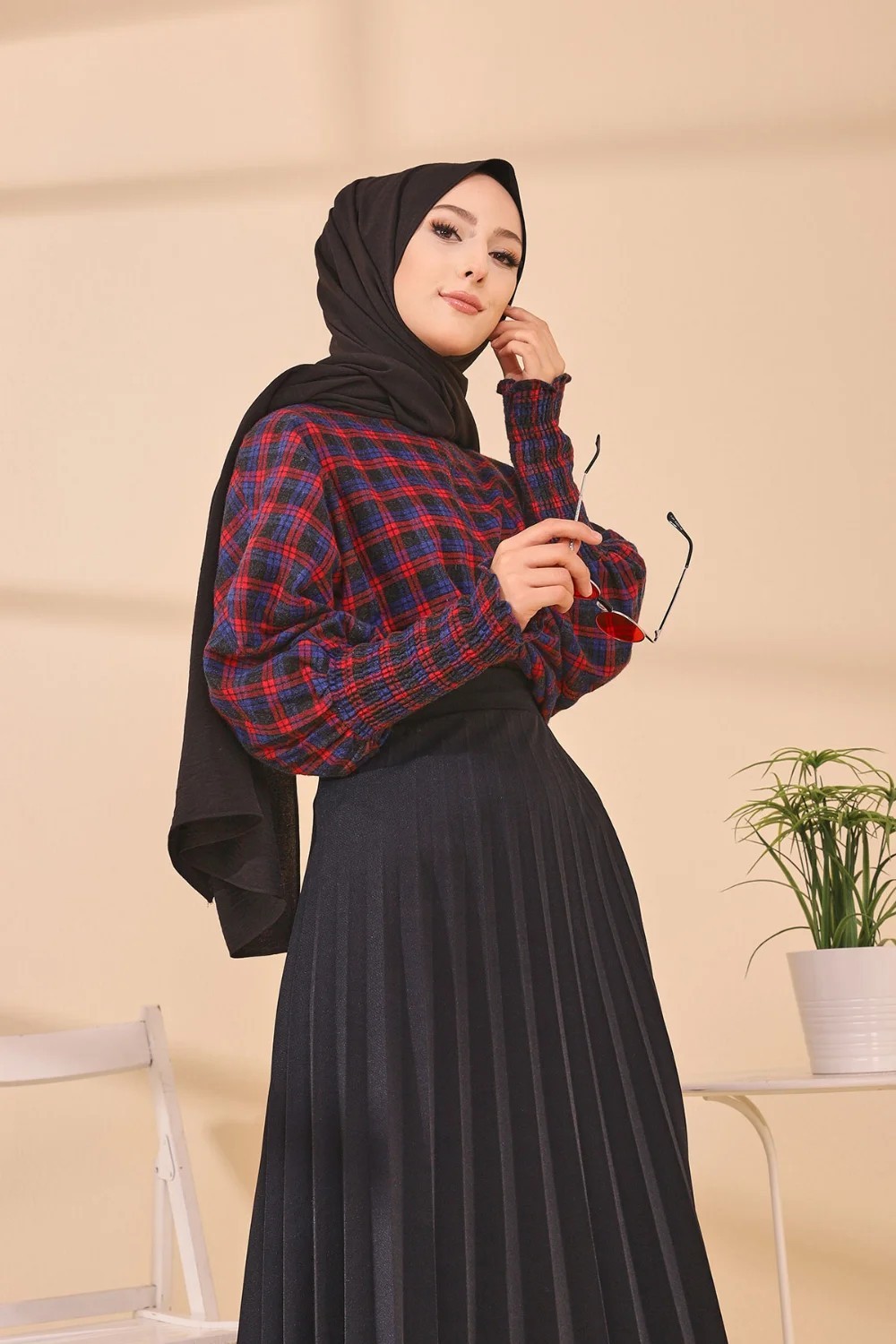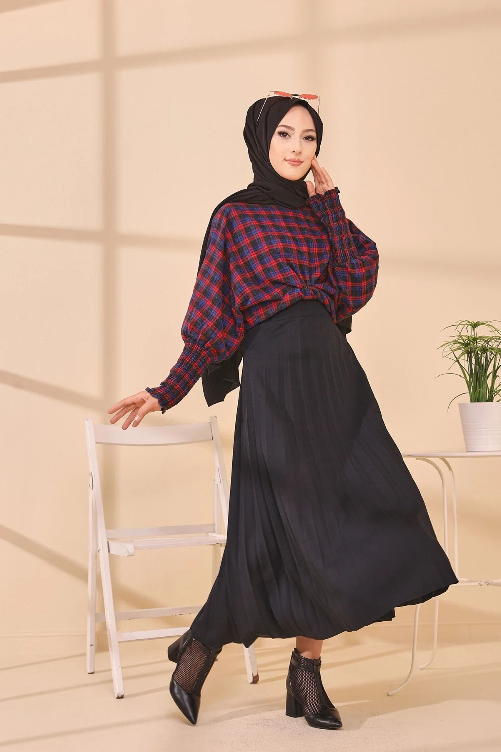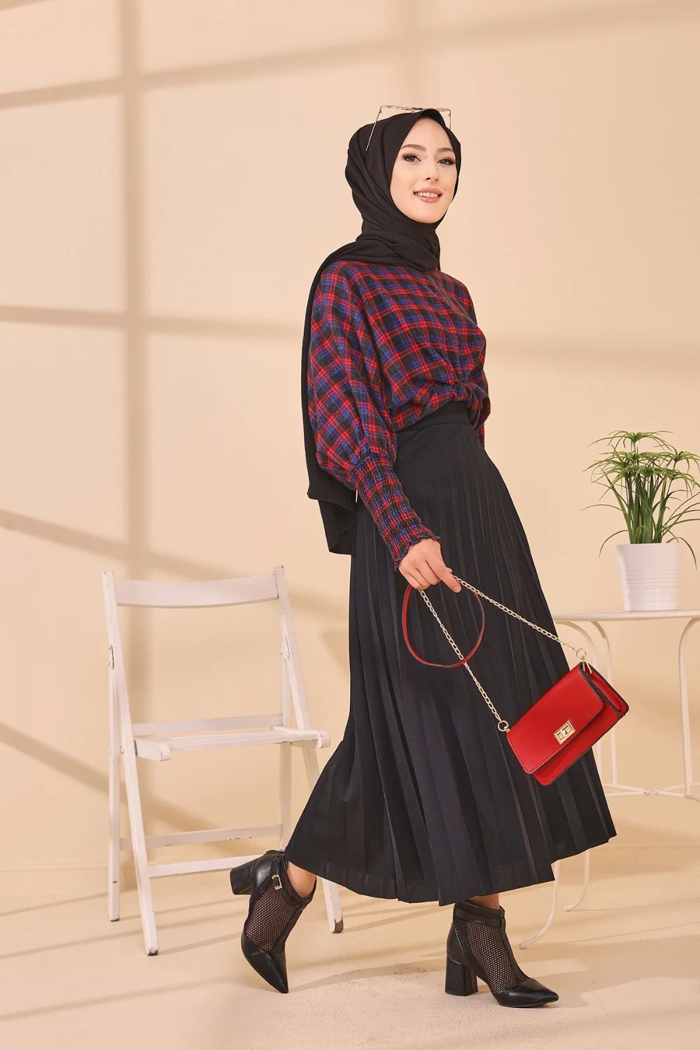 Chemisier à carreaux (Tenue Hijab style habillé) - Couleur bleu et rouge Vetement & Accessoire