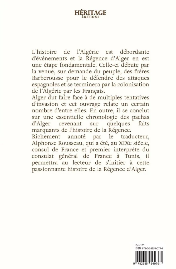 Richement annoté par le traducteur, Alphonse Rousseau, qui a été, au XIXe siècle, consul de France et premier interprète du consulat général de France à Tunis, il permettra au lecteur de s’initier à cette passionnante histoire de la Régence d’Alger.