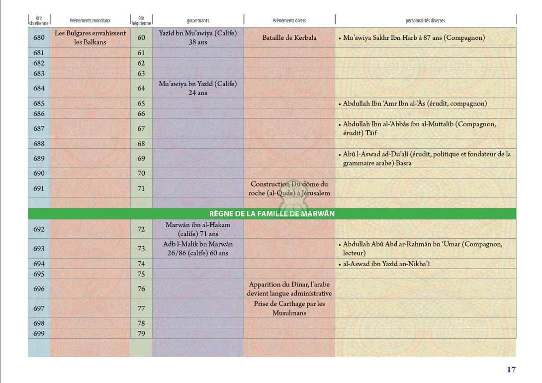 Cette ouvrage a la particularité de proposer une vue succincte de l’histoire de l’Islam, accompagnée d’une chronologie qui réunit les événements, les califes et les savants (scientifiques, théologiens, littéraires, etc..).