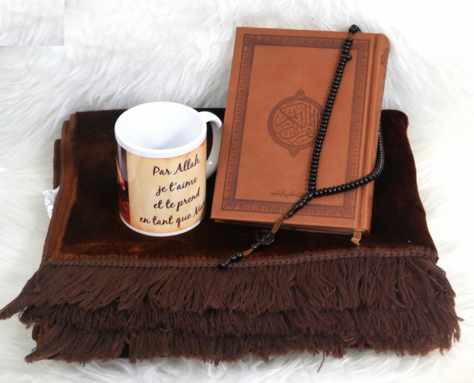 Coffret Cadeau Islam (pour homme) : Le Saint Coran (version Hafs en arabe) + Chapelet + Tapis de priere + Mug personnalise