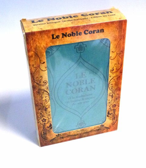 Le Noble Coran avec couverture cartonnée de type cuir, doux au toucher. Très jolie couleur tirant vers le bleu. Idéal pour offrir. Avec sa boite cadeau.