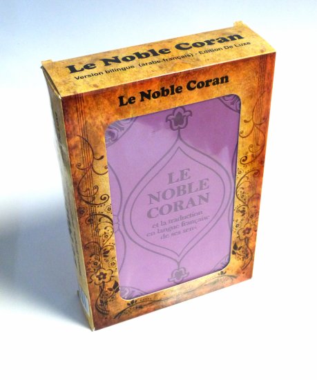 Le Noble Coran avec couverture cartonnée de type cuir, doux au toucher. Très jolie couleur entre le mauve et le magenta. Idéal pour offrir. Fourni dans sa boite cadeau.