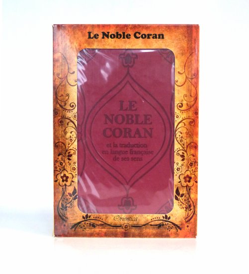 Le Noble Coran avec couverture cartonnée de type cuir, doux au toucher. Très jolie couleur tirant vers le bordeaux. Idéal pour offrir. Fourni avec sa boite cadeau.
