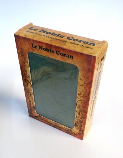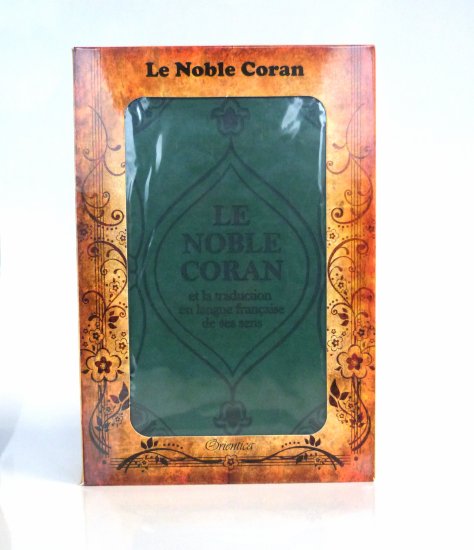 Le Noble Coran avec couverture cartonnée de type cuir, doux au toucher. Très jolie couleur tirant vers le vert foncé. Idéal pour offrir. Avec sa boite cadeau.