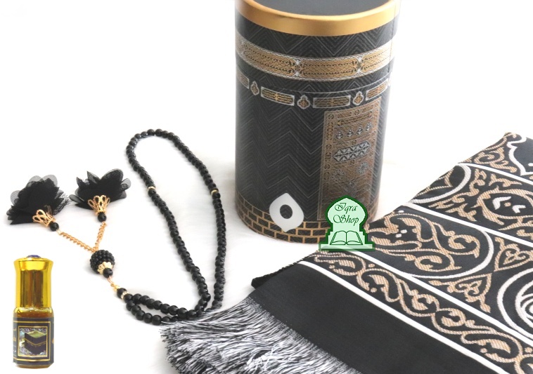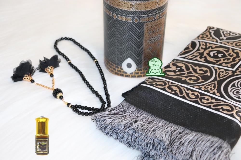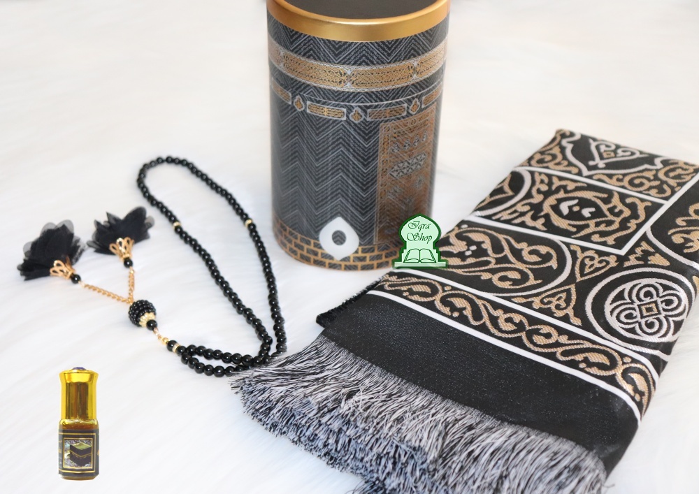 Coffret Cadeau Muslim boite ronde Kaaba (Couleur noire dore assorti) avec tapis de priere et chapelet de luxe + Parfum Musc Al-Kaaba