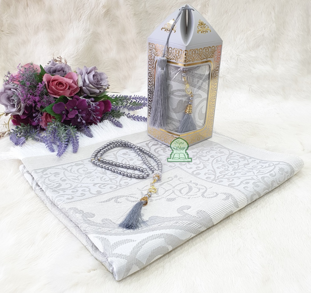 Coffret Cadeau Musulman dore : Tapis decore brillant et Chapelet (Sebha) - Couleur Gris clair