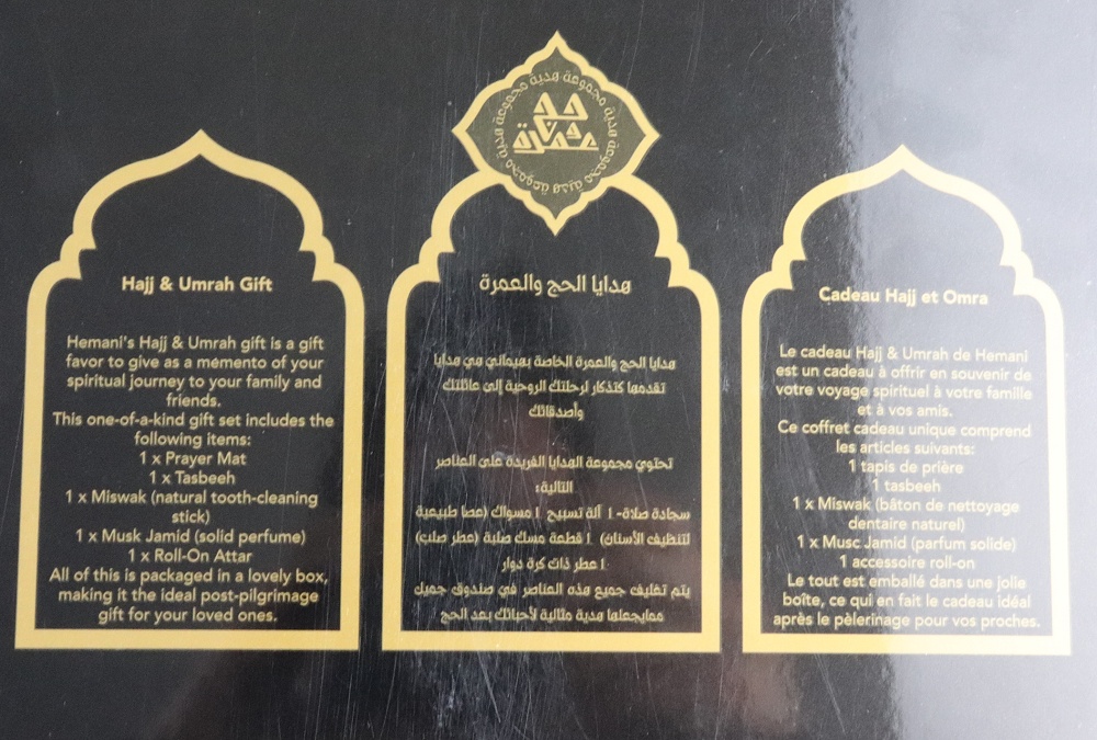 Coffret Cadeau Musulman pour le pèlerin (Pack Hadj et 'Omra) avec livres, tapis, siwak, parfum - Boite noire dorée - Hajj & Umrah Gift - REF. 39775 (19.90 €)