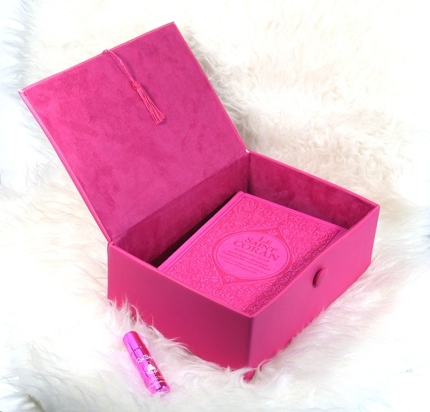 Coffret Cadeau Rose : Le Saint Coran Rainbow (francais/arabe/phonetique), Coffret artisanal de luxe et parfum pour femme