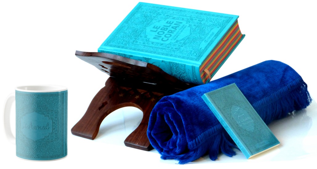 Pack cadeau bleu (mixte) : Le Noble Coran (bilingue français/arabe) + La Citadelle du Musulman + Porte Coran + Tapis de prière en velours + Parfum Musc d'Or Luxe (au choix) - REF. 23269 (39.00 €)
