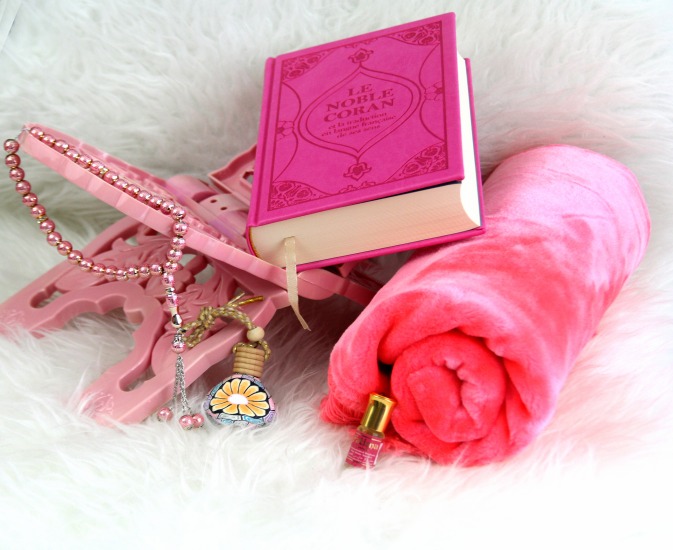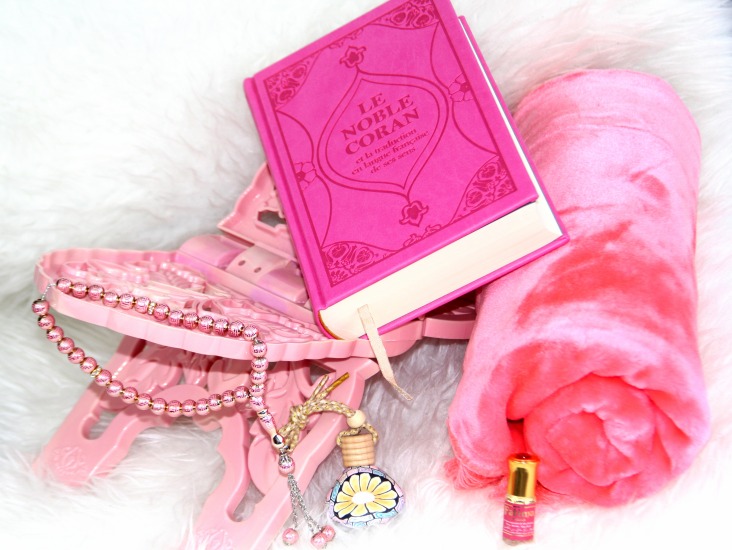 Coffret/Pack cadeau prière pour femme : Tapis rose, Coran luxe rose, Porte Coran, Diffuseur de parfums, parfum Musc d'Or et chapelet perles - REF. 21951 (45.00 €) |