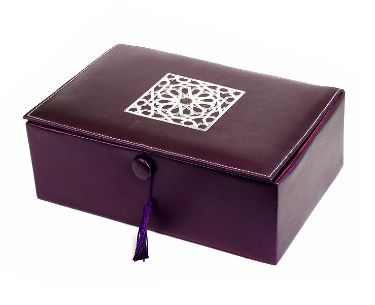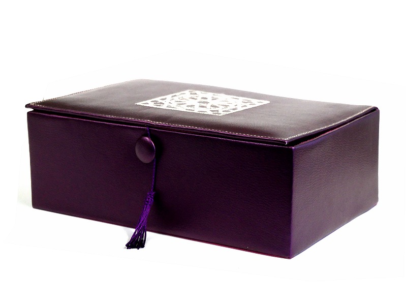 Coffret artisanal de luxe violet en cuir avec motifs rosace argente brodes