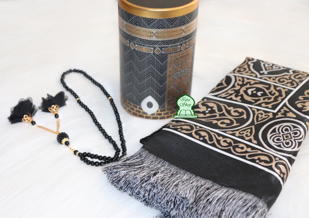 Coffret Cadeau Prière Tapis et chapelet de luxe (boite ronde dorée) - Couleur noir avec motif de la Kaaba - REF. 40032 (14.90 €)