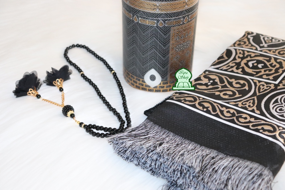 Très bel ensemble constitué des produits avec motifs kaaba, de couleur noir doré. Un grand tapis adulte et un chapelet sebha de luxe.