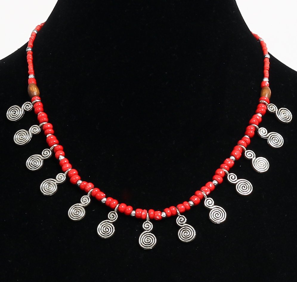 Collier ethnique artisanal imitation perles corail rouge agencées de perles argentées et de petites breloques tourbillon en métal - REF. 19061 (18.00 €)