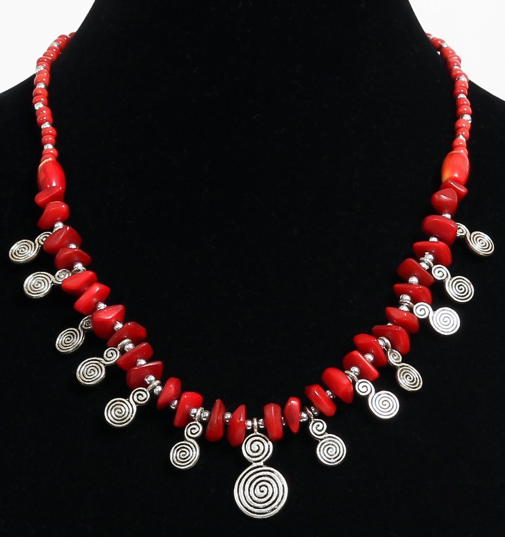 Collier ethnique artisanal imitation perles corail rouge agencées de perles argentées et de petites breloques tourbillon en métal - REF. 19061 (18.00 €)