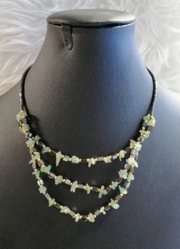 Collier ethnique artisanal imitation petites pierres vertes agrémentées de perles en métal et vertes - REF. 18969 (18.00 €)