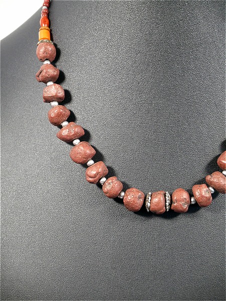Collier ethnique artisanal imitation pierres corail agencée de perles et agrémentées de pièces en métal argenté - REF. 19130 (26.00 €)