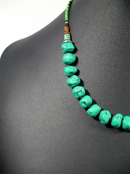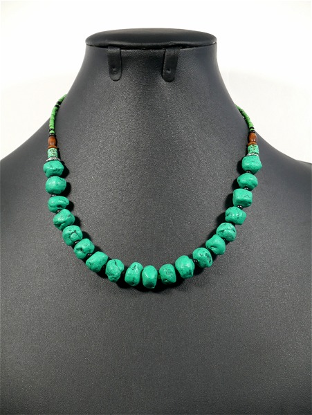 Collier ethnique artisanal imitation pierres difformes turquoises séparées de perles en métal avec une boule en métal et des perles vertes - REF. 18947 (14.00 €)