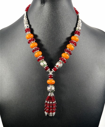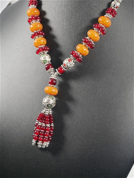 Collier ethnique artisanal avec pierres orange et bordeaux agremente de breloques et d'armatures argentees
