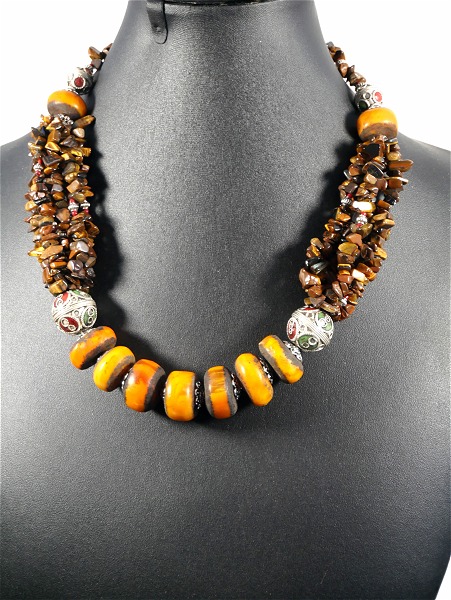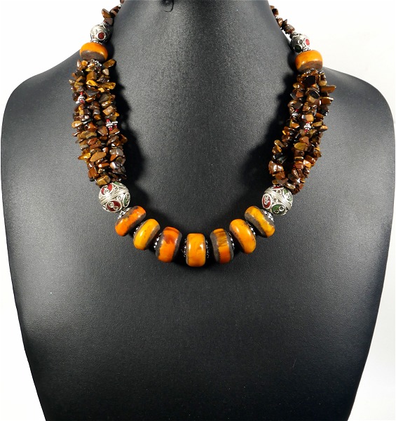 Collier ethnique artisanal avec pierres orange et marron agrémenté de breloques et d'armatures argentées Vetement & Accessoire